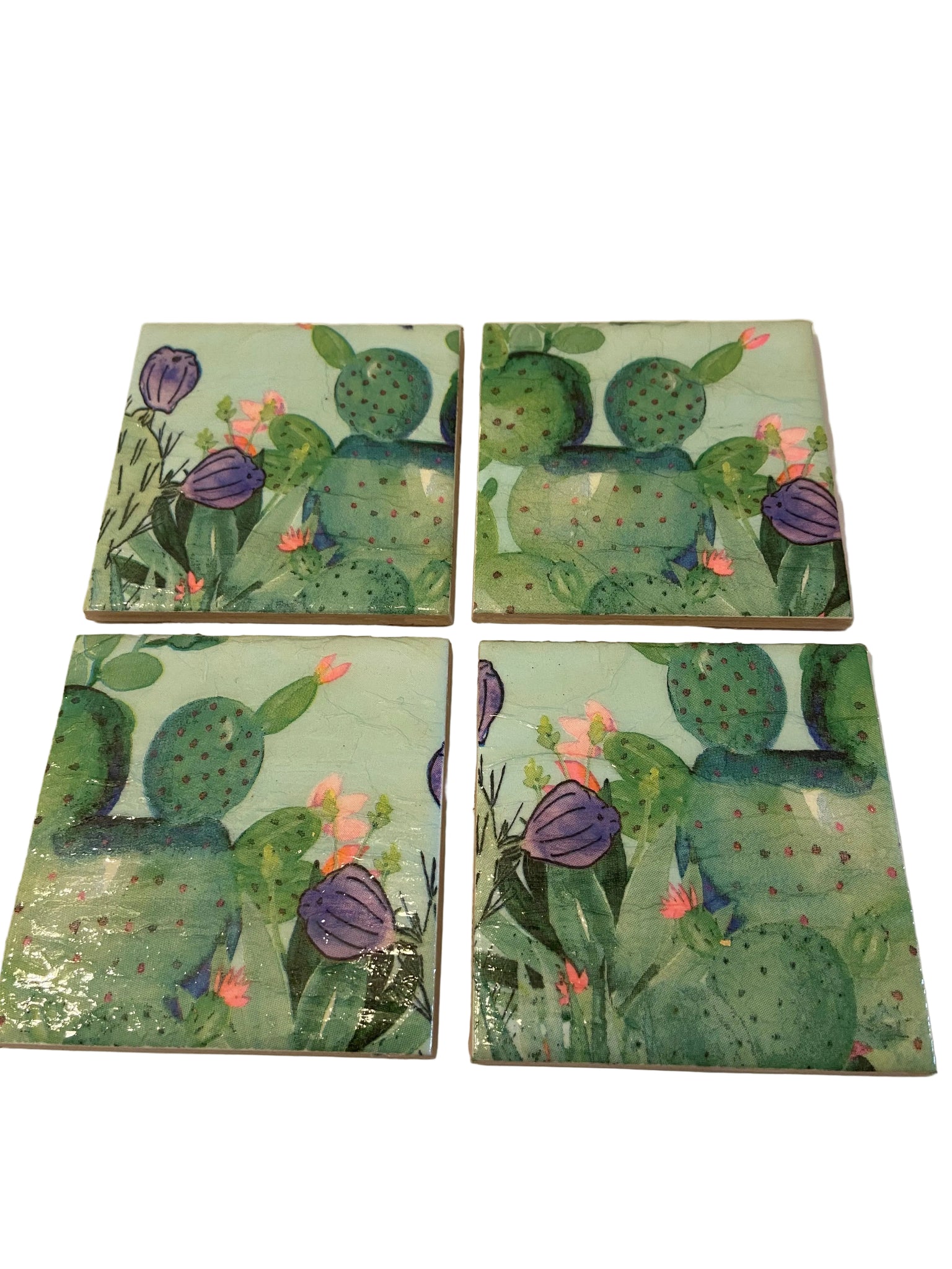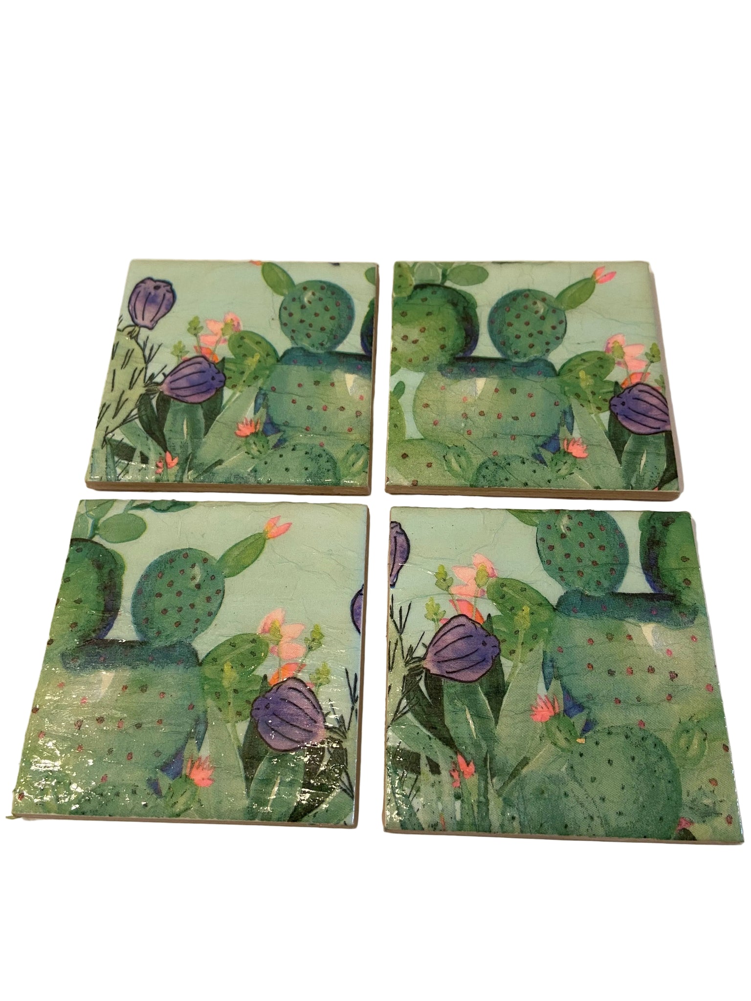A set of 4 Ceramic and Decoupage Coasters with a jolly cactus design.