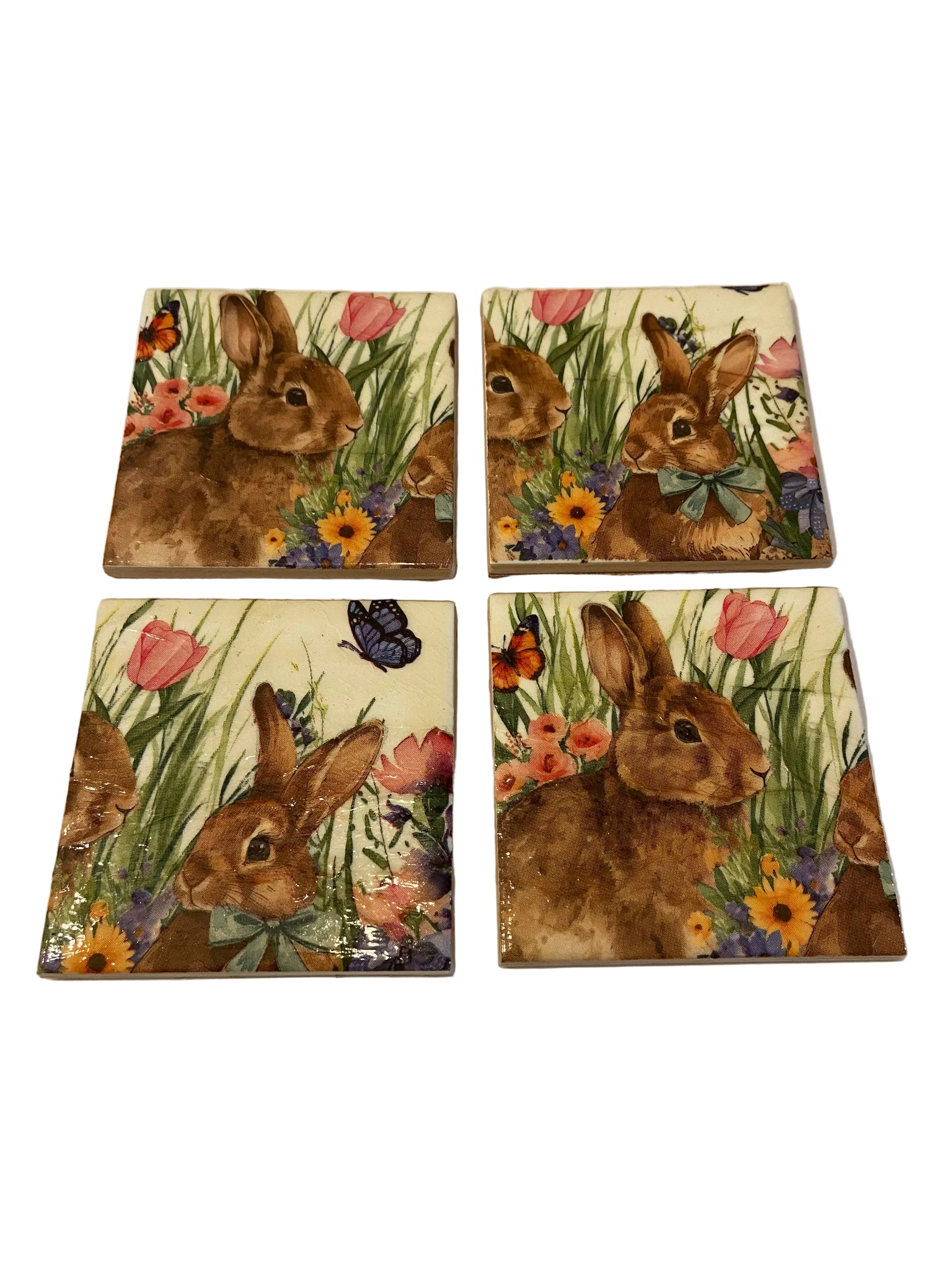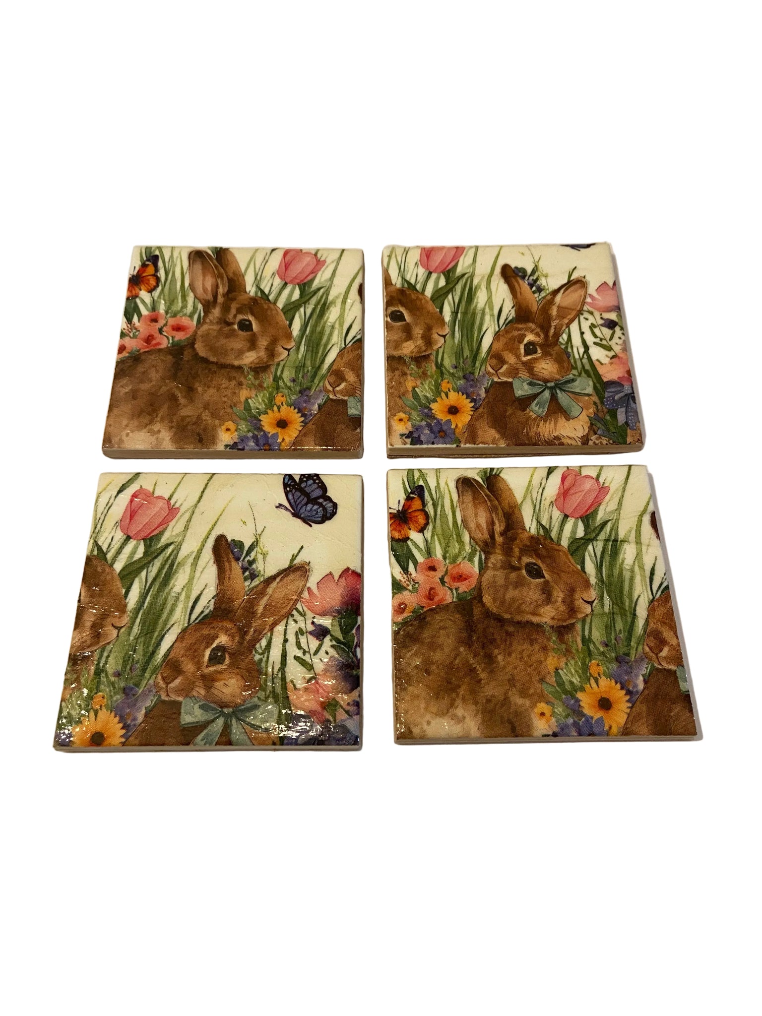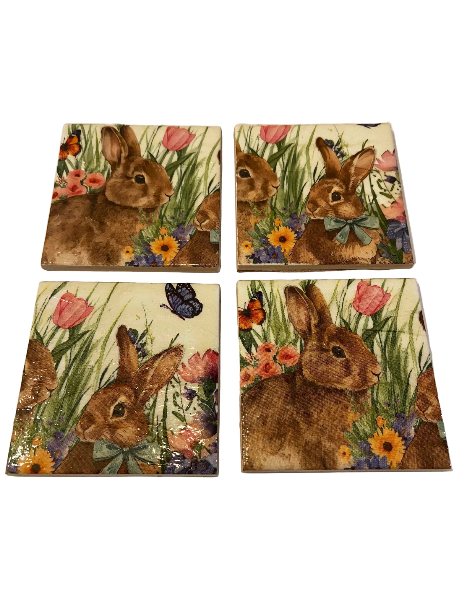 A set of 4 Ceramic and Decoupage Coasters with a gorgeous bunny design.