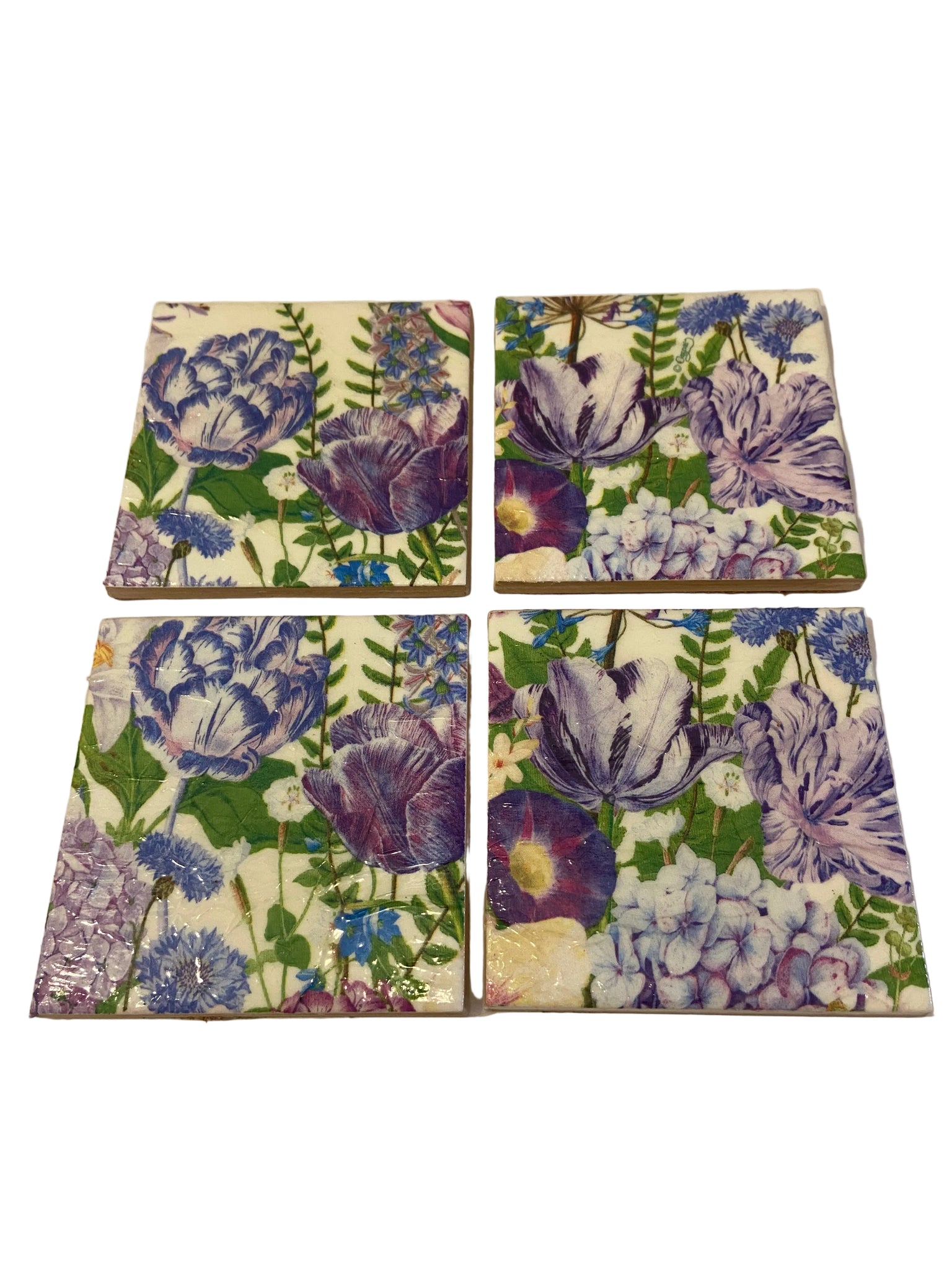 A set of 4 Ceramic and Decoupage Coasters with a gorgeous blue, white & purple flower design.
