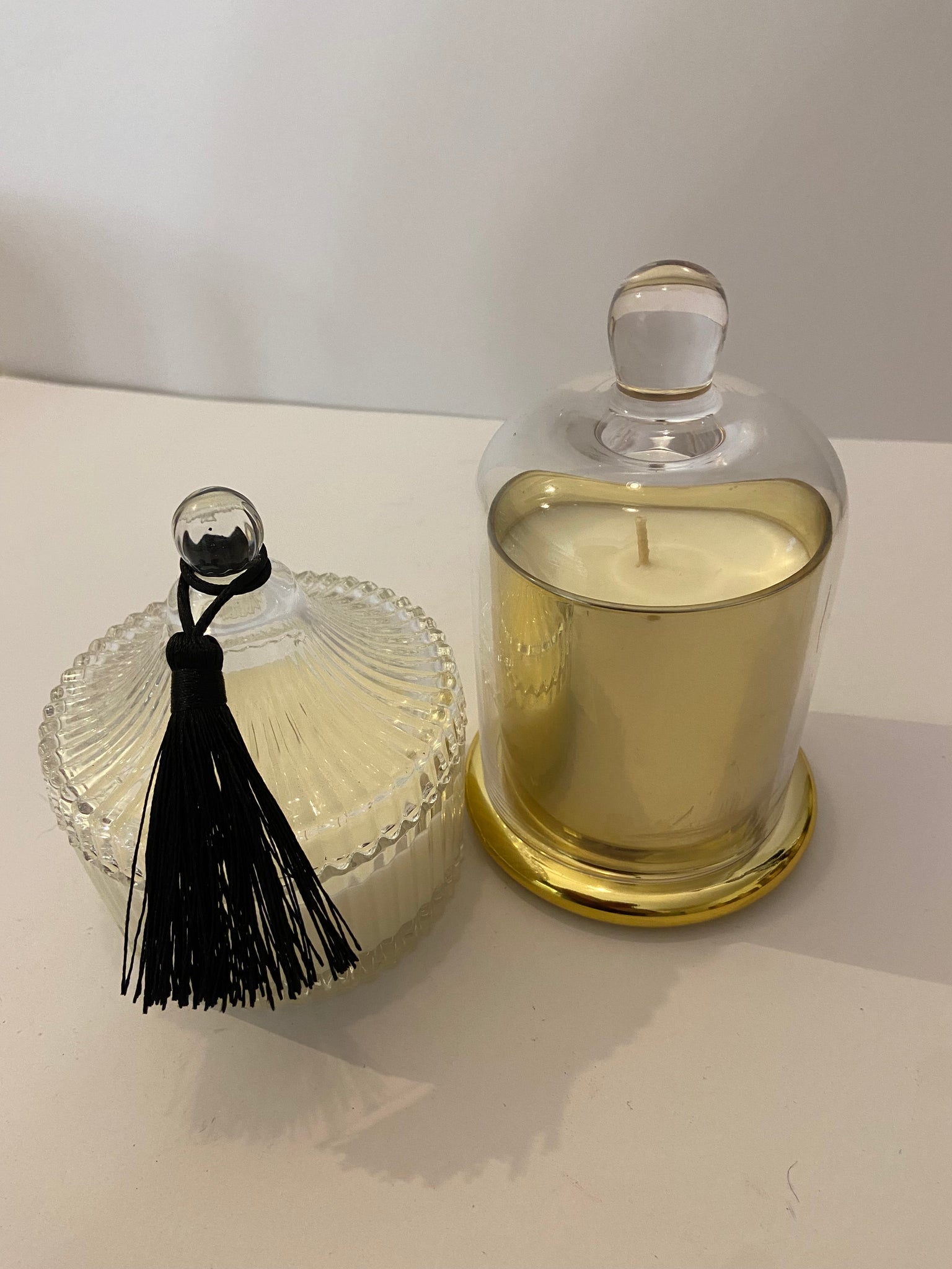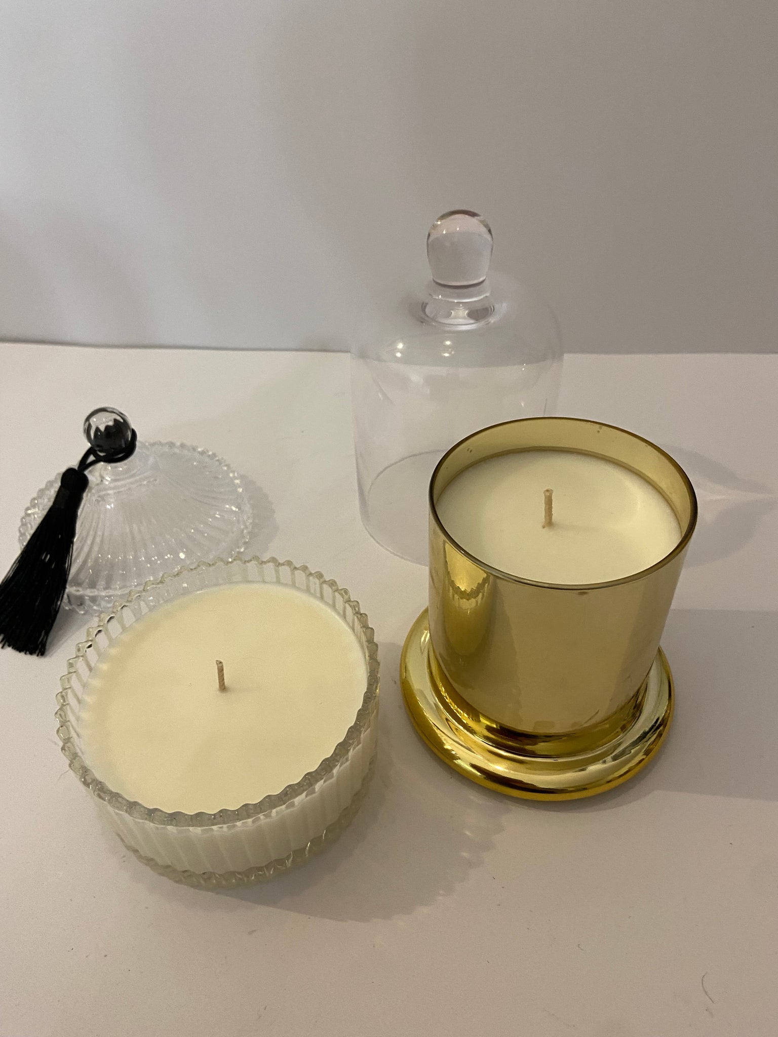 A variety of Candles in beautiful vessels that you can use after your candle has finished. The gold cloche candle is Havana ($40) - a blend of leather, smoke, whiskey and a touch of blackberry & the glass with lid candle is Armour ($30)- a romantic & beautiful blend of caramel, vanilla, latte & a touch of salt.