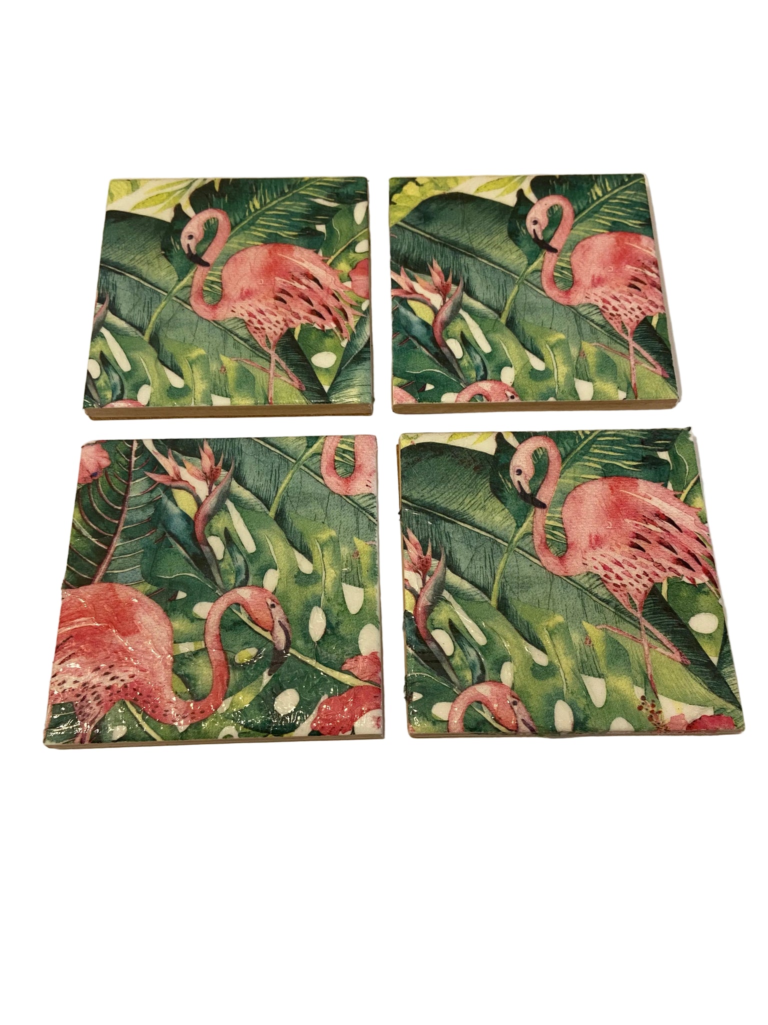 A set of 4 Ceramic and Decoupage Coasters with a jolly flamingo design.