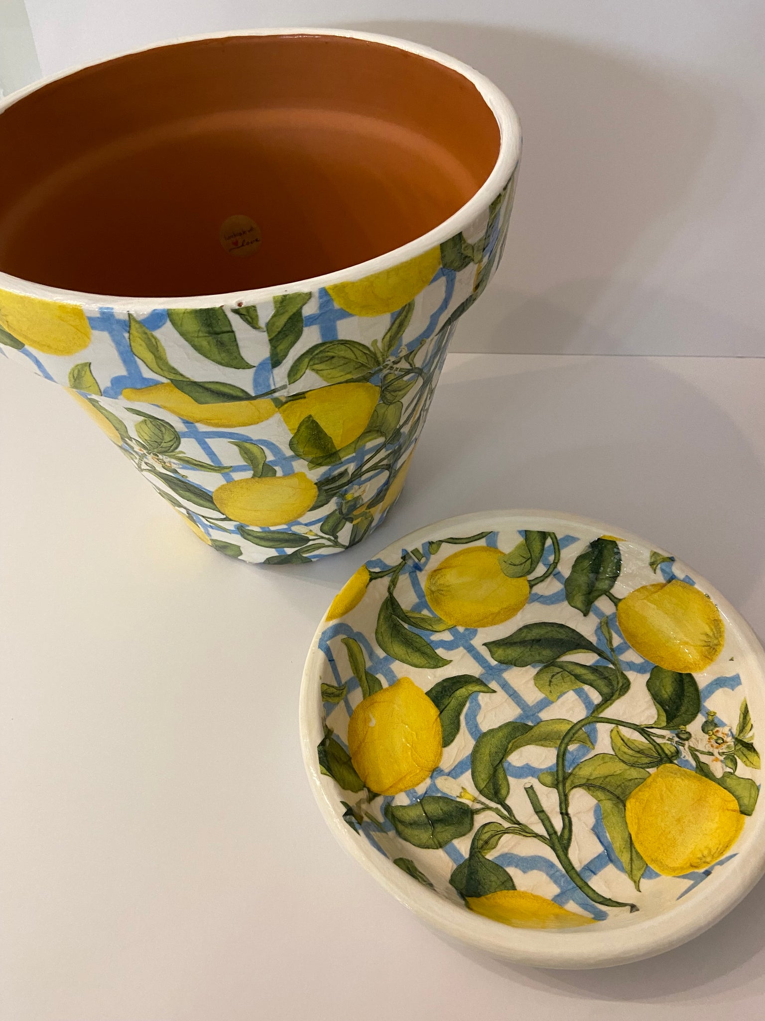 Hand painted white terracotta pot, decoupaged with a gorgeous lemon design and a matching base plate. Pot is sealed and suitable for inside or undercover use.