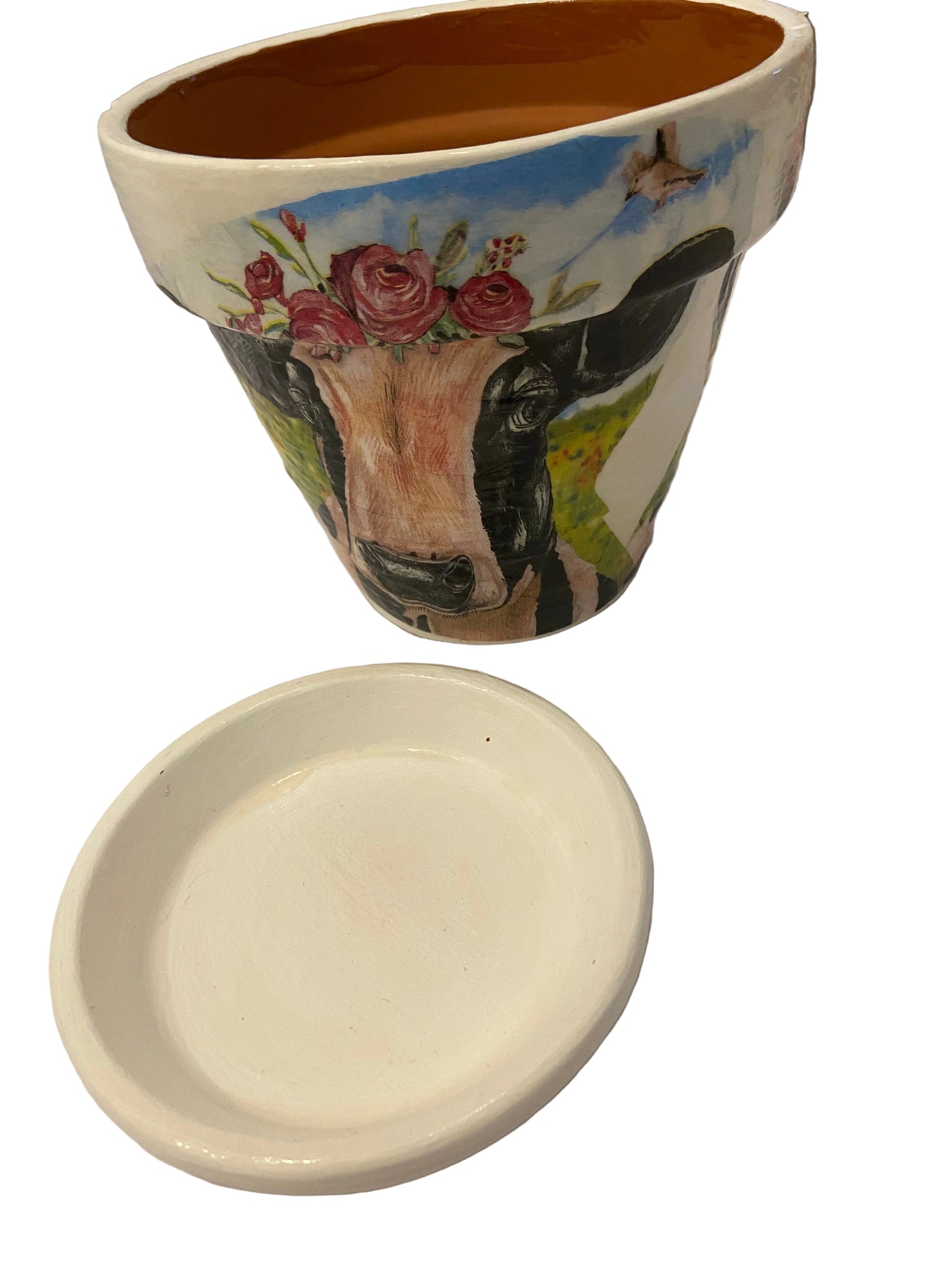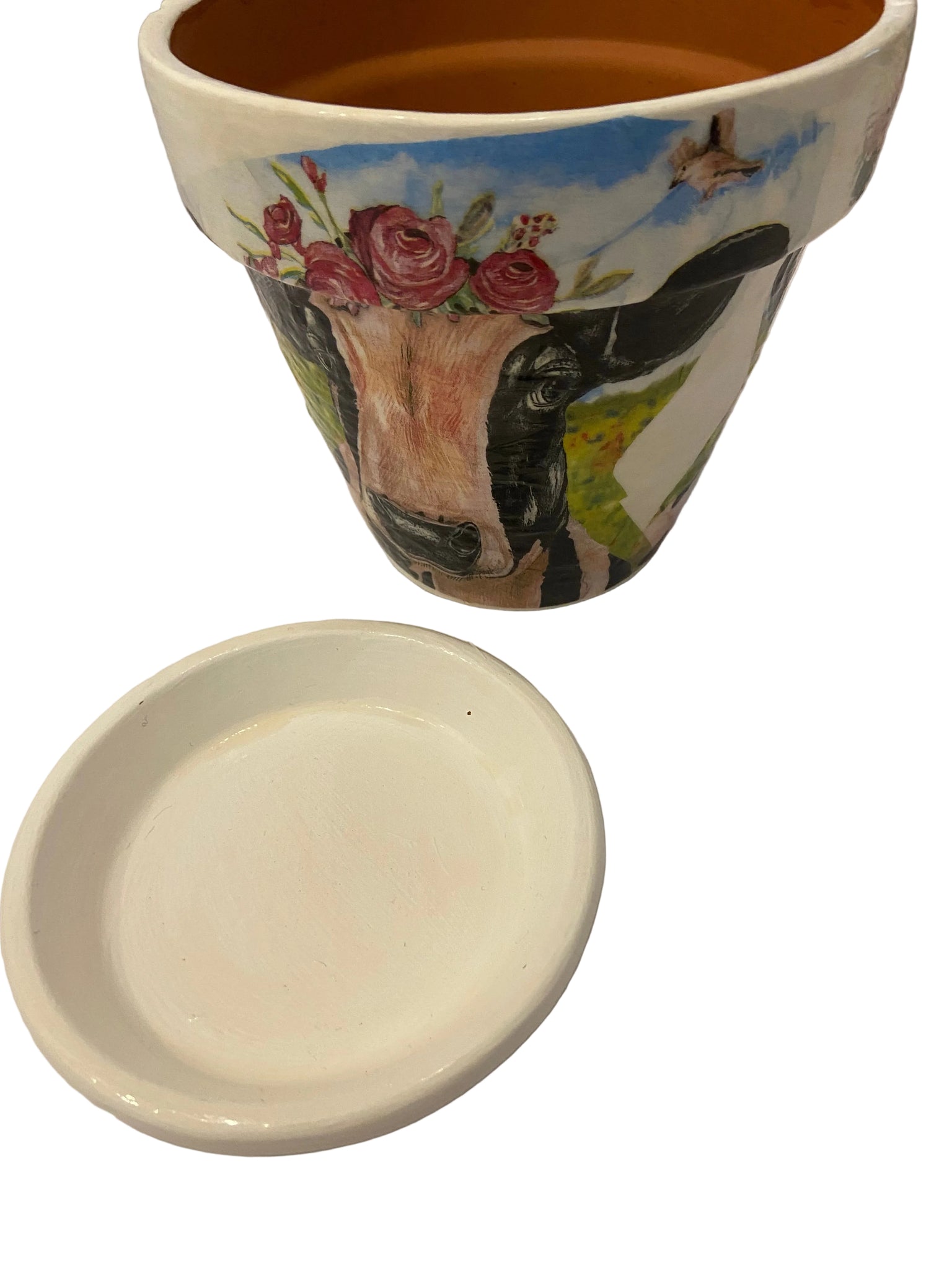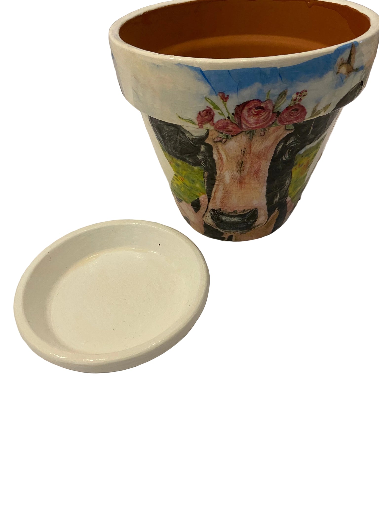 Hand painted white terracotta pot, decoupaged with a jolly "Moo" design & comes with a coordinating base plate. Pot is sealed and suitable for inside or undercover use.