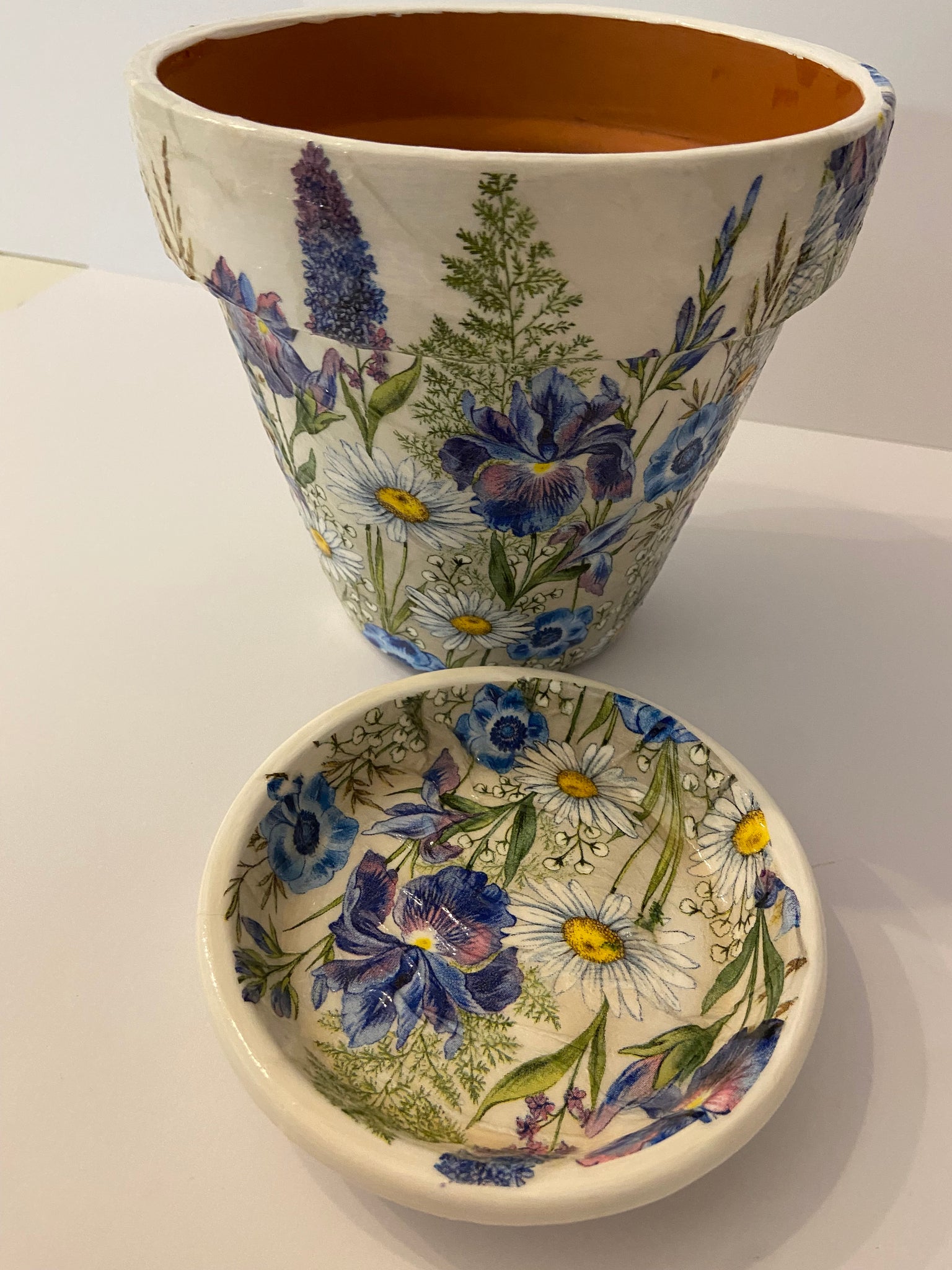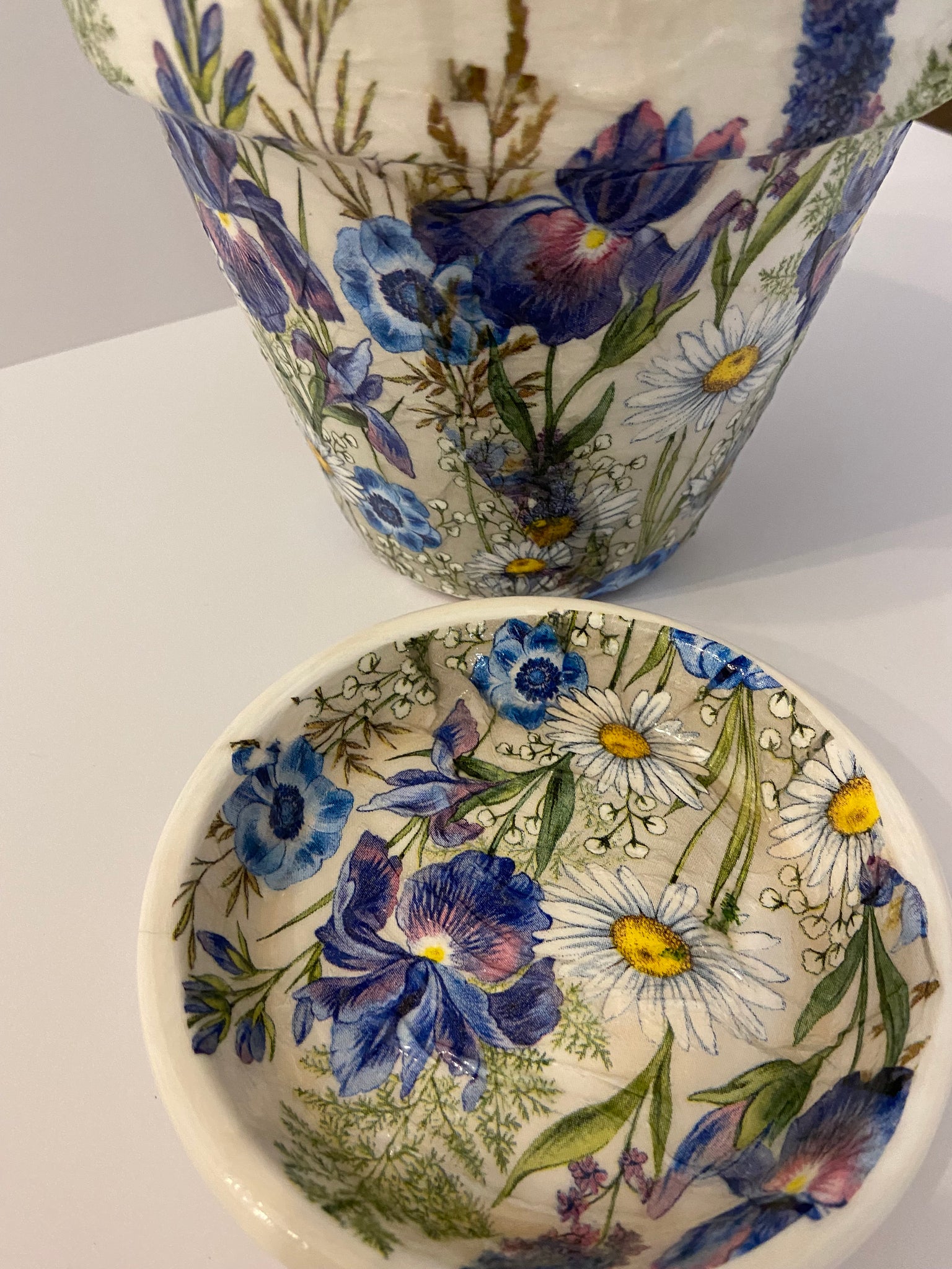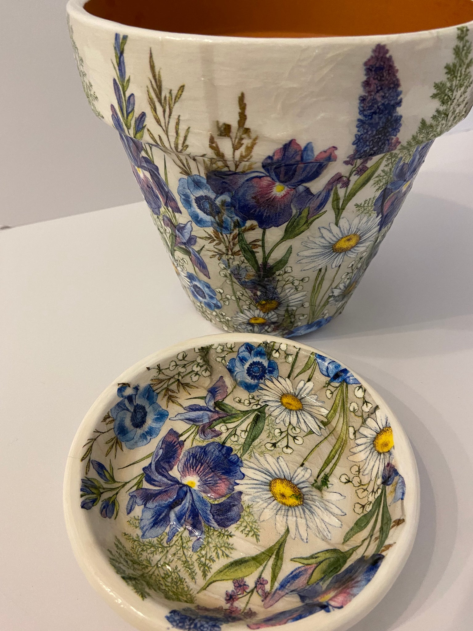 Hand painted white terracotta pot, decoupaged with a beautiful floral design in blue, white & yellow and comes with a matching base plate. Pot is sealed and suitable for inside or undercover use.