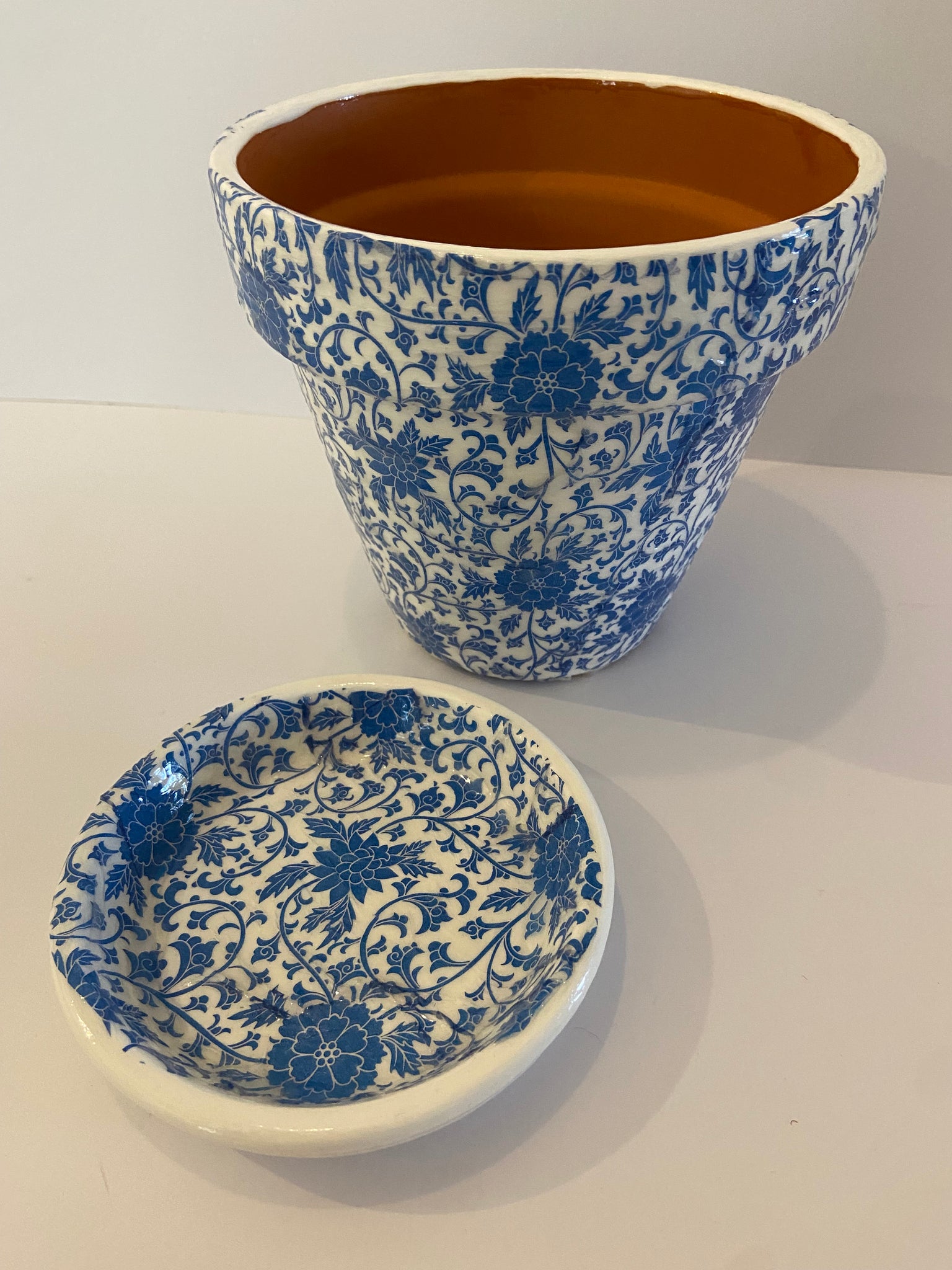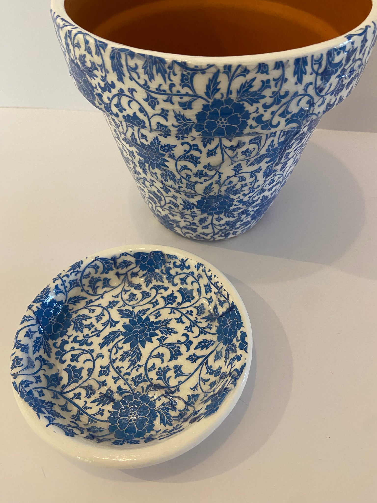 Hand painted white terracotta pot, decoupaged with a gorgeous blue floral design & comes with a coordinating base plate. Pot is sealed and suitable for inside or undercover use.