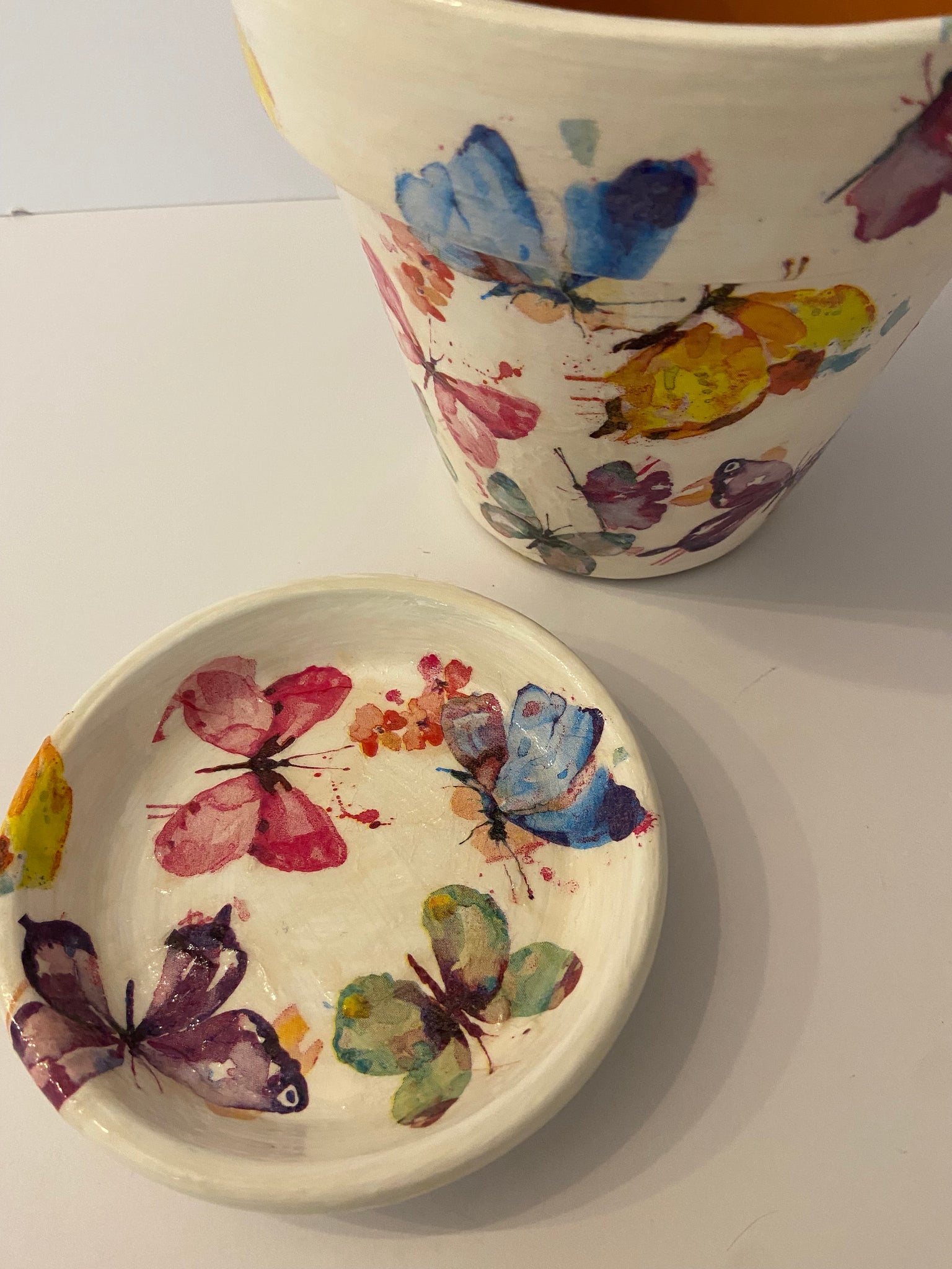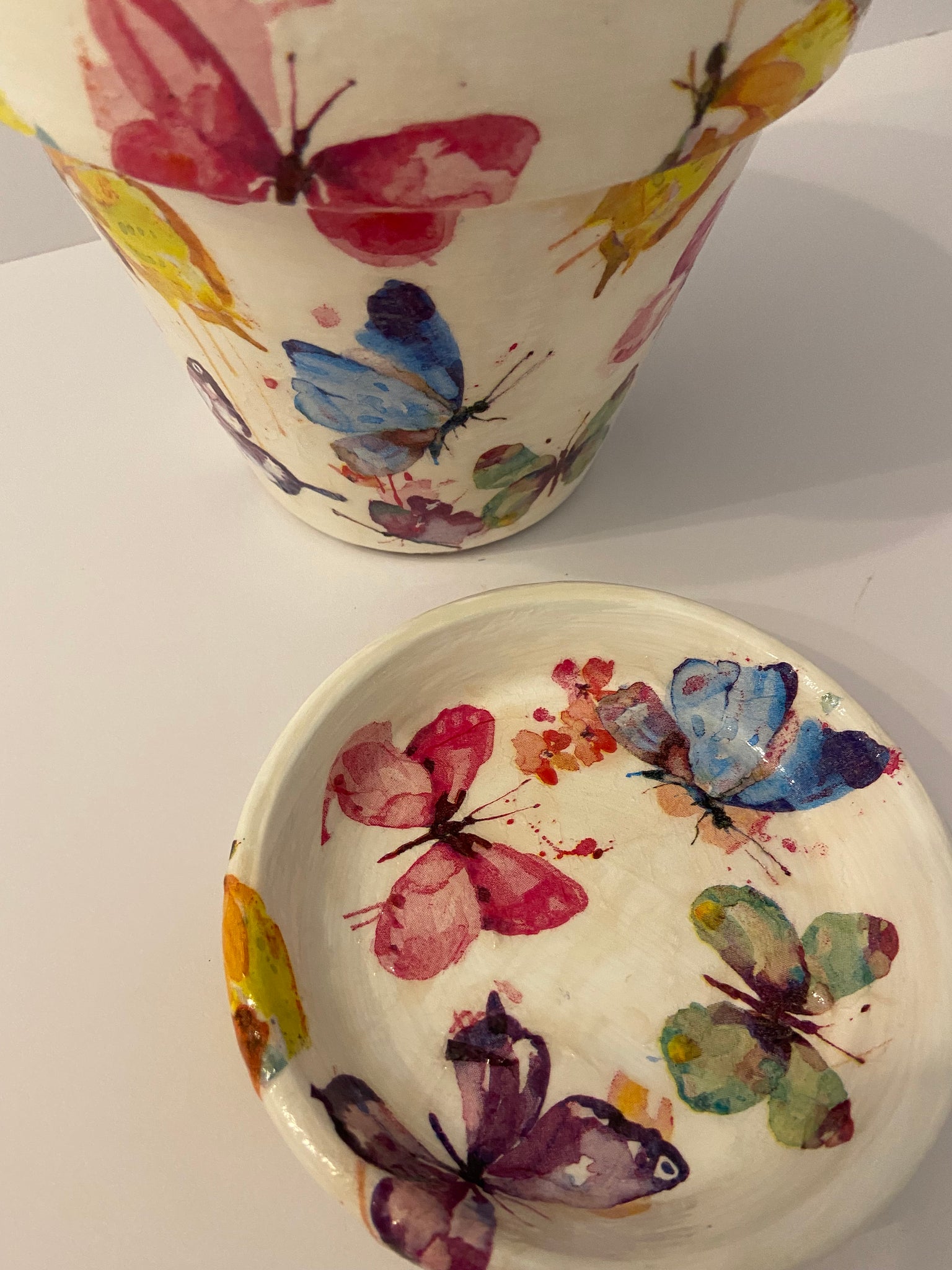 Hand painted white terracotta pot, decoupaged with a beautiful butterfly design and comes with a matching base plate. Pot is sealed and suitable for inside or undercover use.