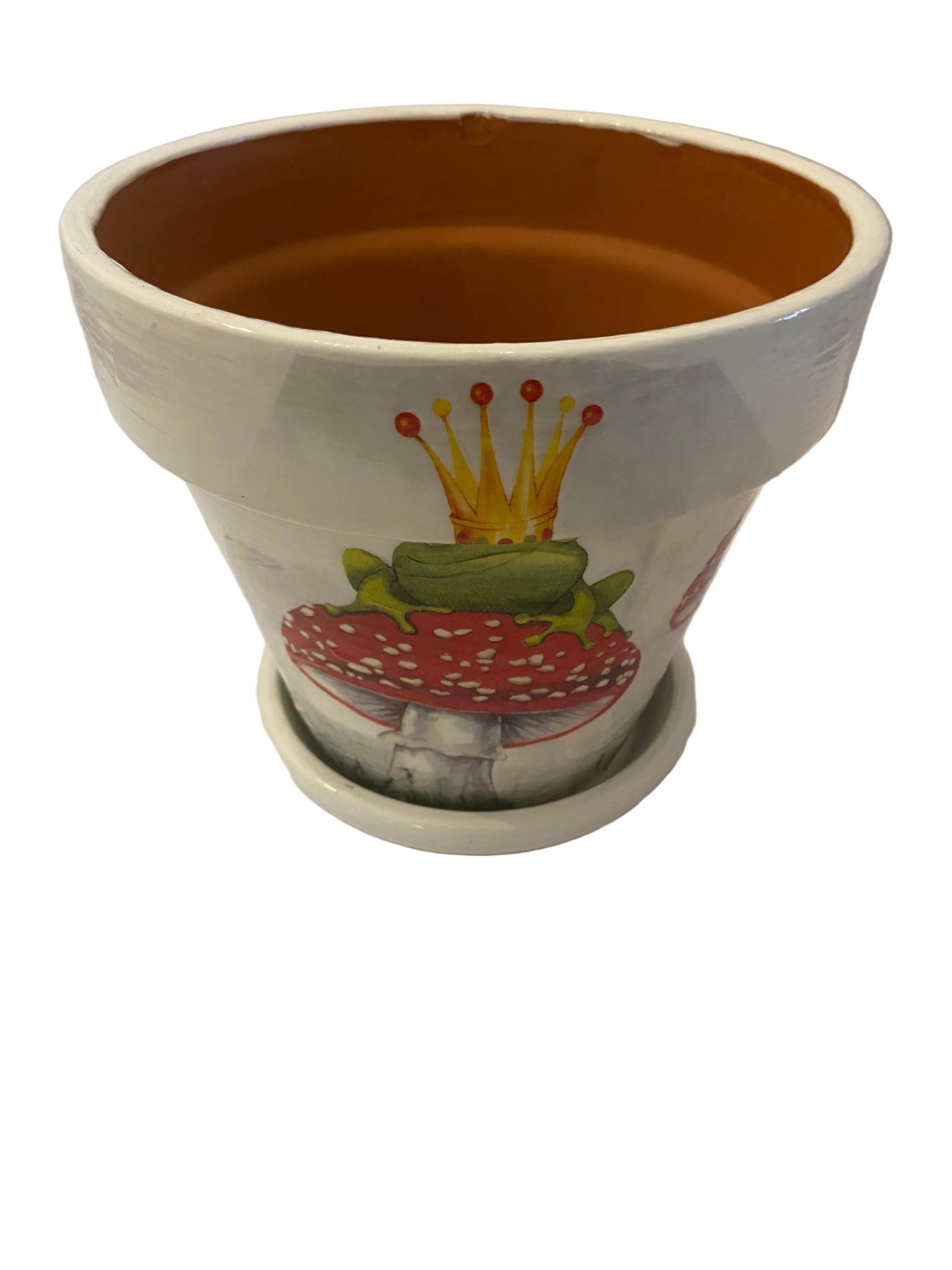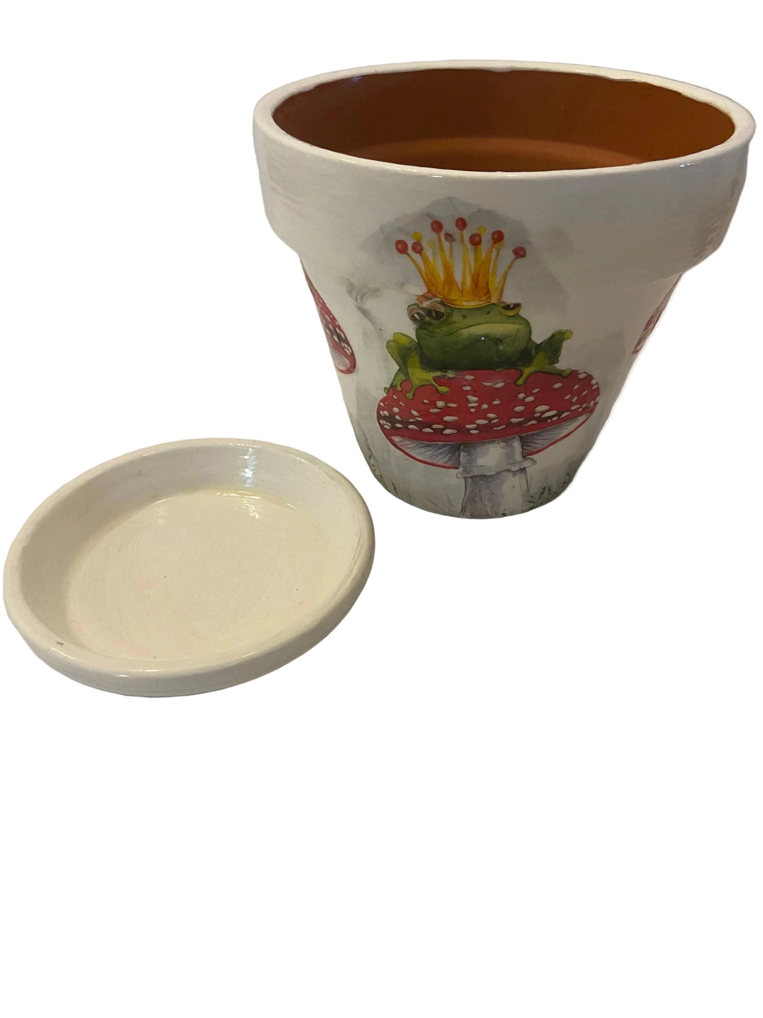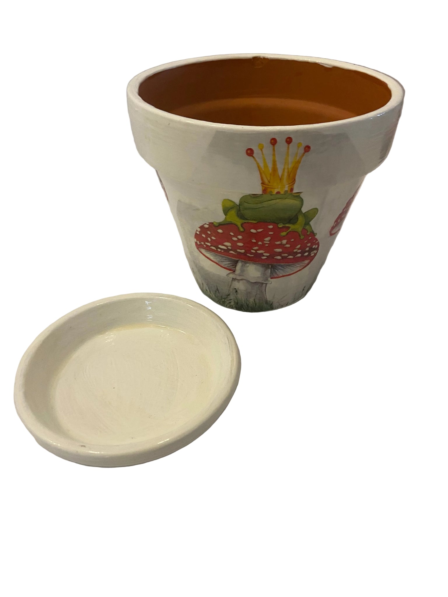 Hand painted white terracotta pot, decoupaged with a jolly frog design & comes with a coordinating white base plate. Pot is sealed and suitable for inside or undercover use.