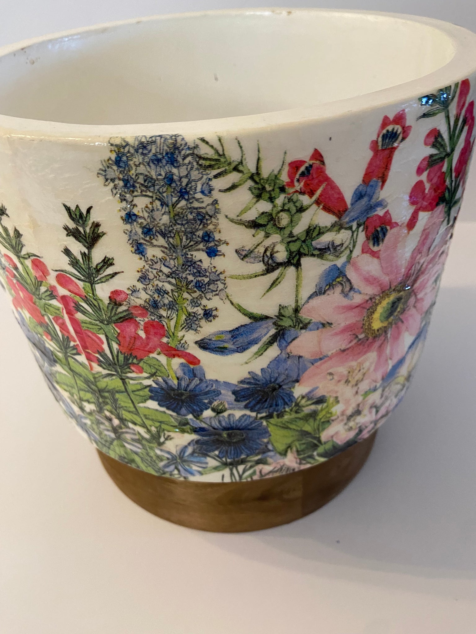 White pot with wooden base, decoupaged with a gorgeous floral design. Pot is sealed and suitable for inside or undercover use.