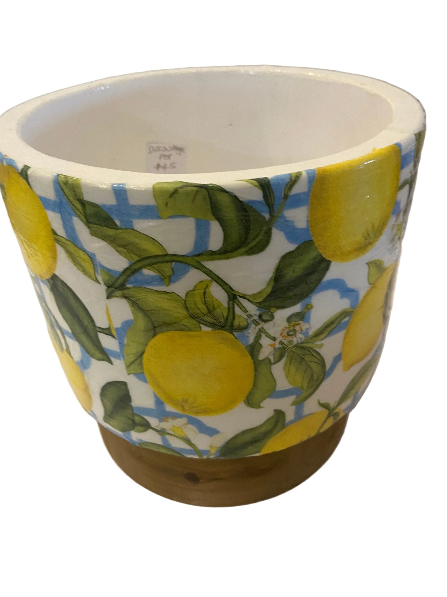 White pot with wooden base, decoupaged with a gorgeous lemon design. Pot is sealed and suitable for inside or undercover use.