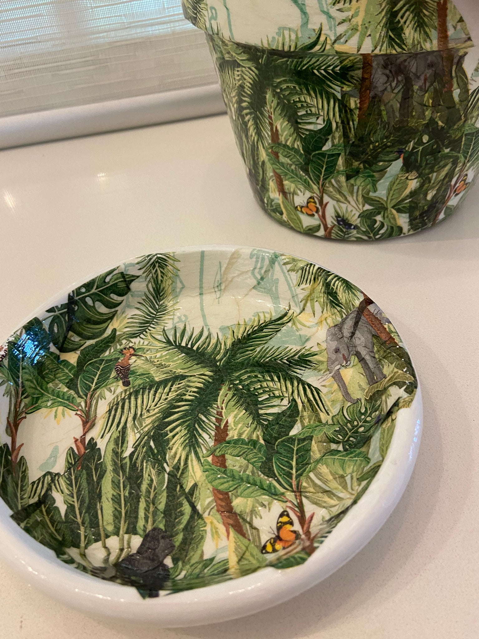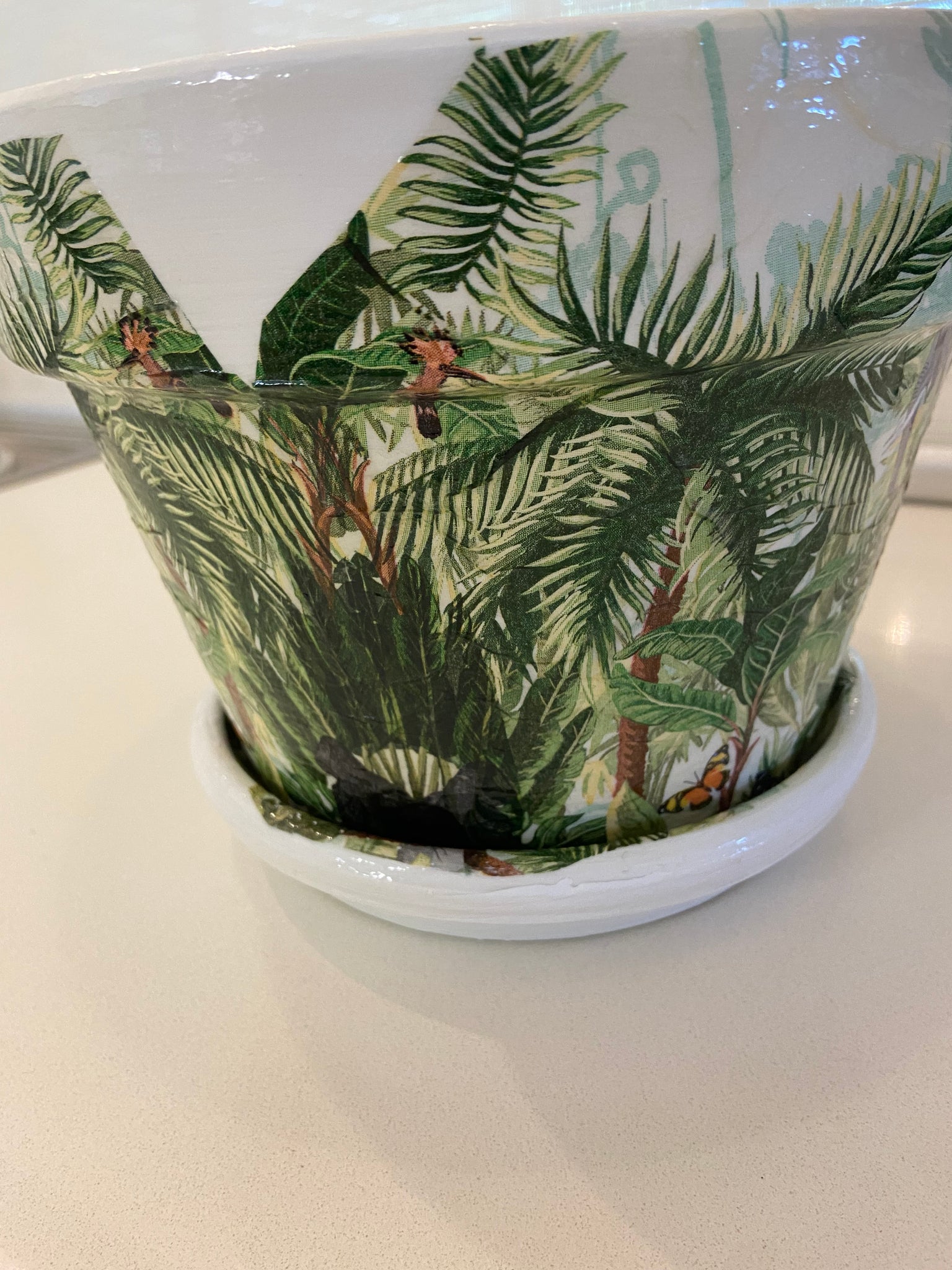 Hand painted in white terracotta pot, decoupaged with a jolly jungle design and comes with a coordinating base plate. Pot is sealed and suitable for inside or undercover use.