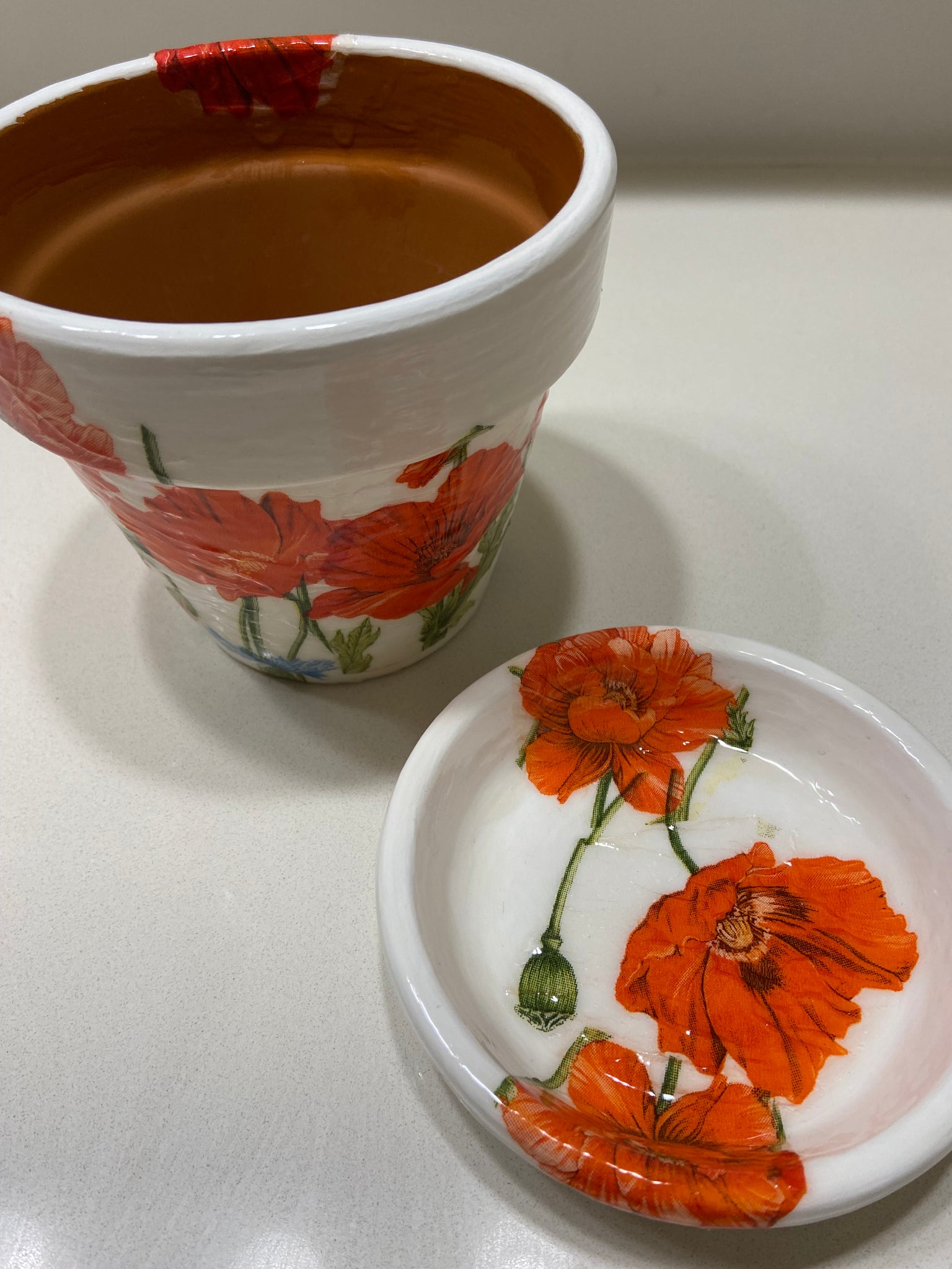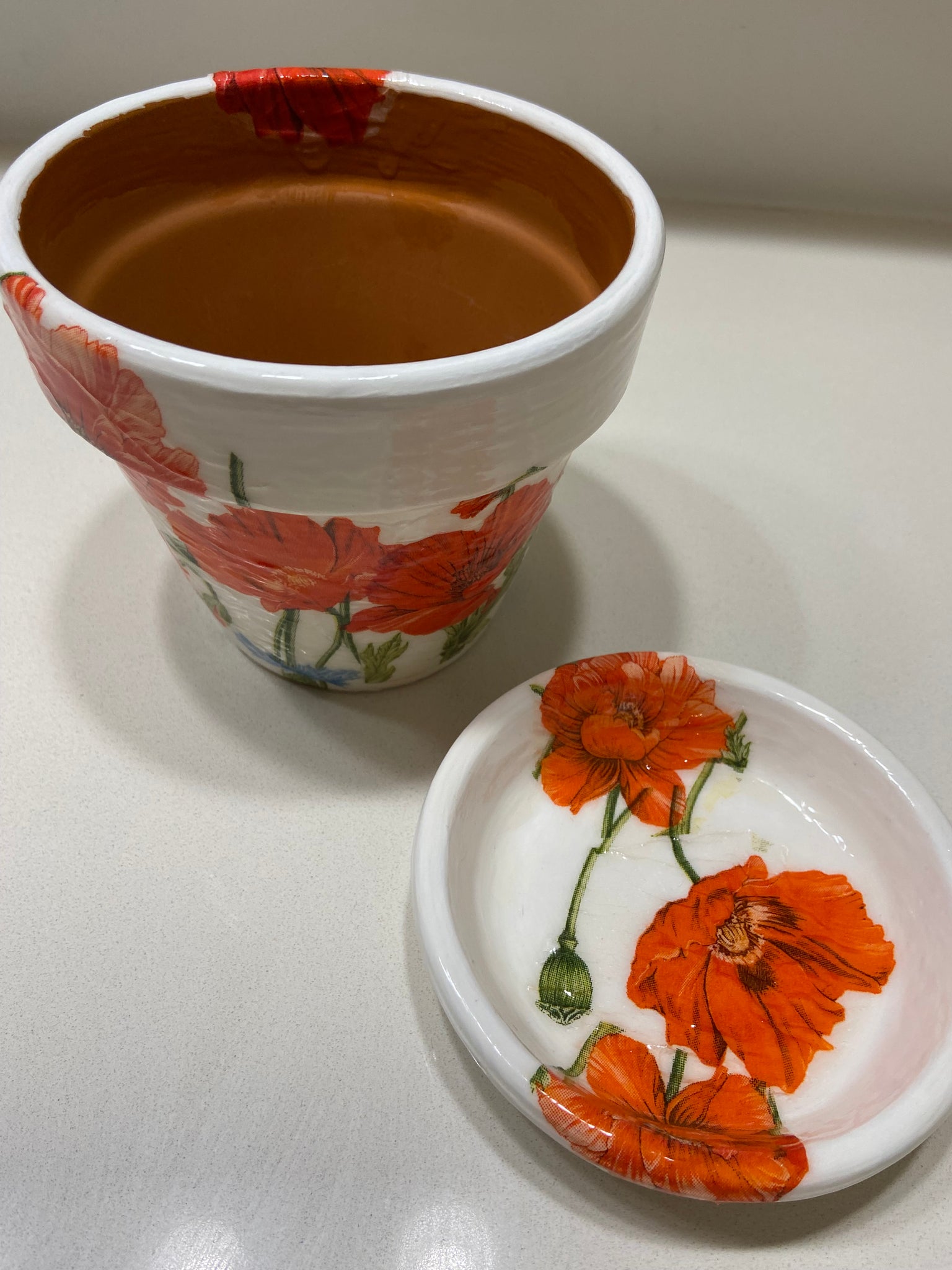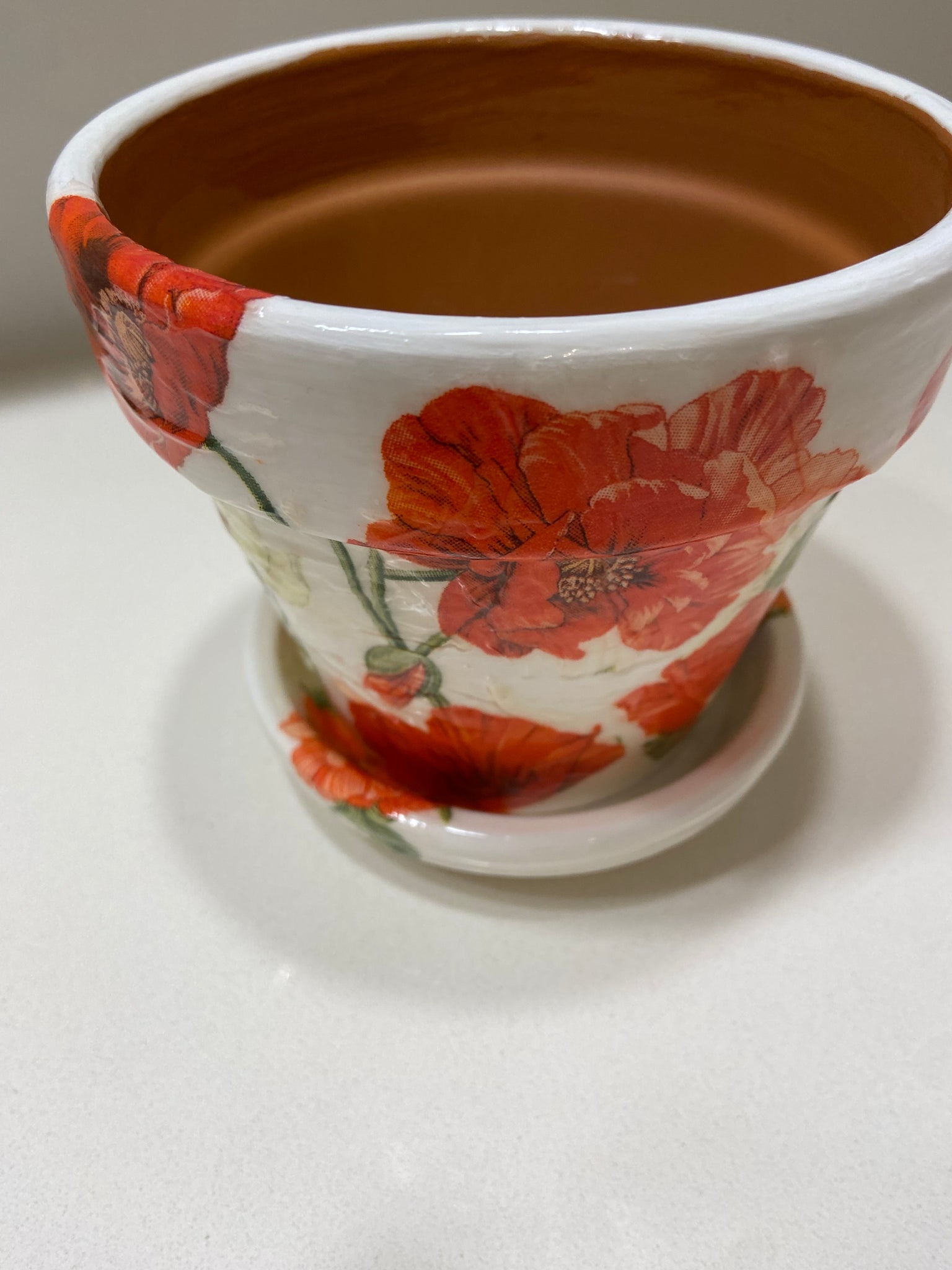 Hand painted white terracotta pot with a gorgeous poppy design in reds on a white background & a base plate. The pot and base have been externally sealed and are suitable for indoors and undercover use.