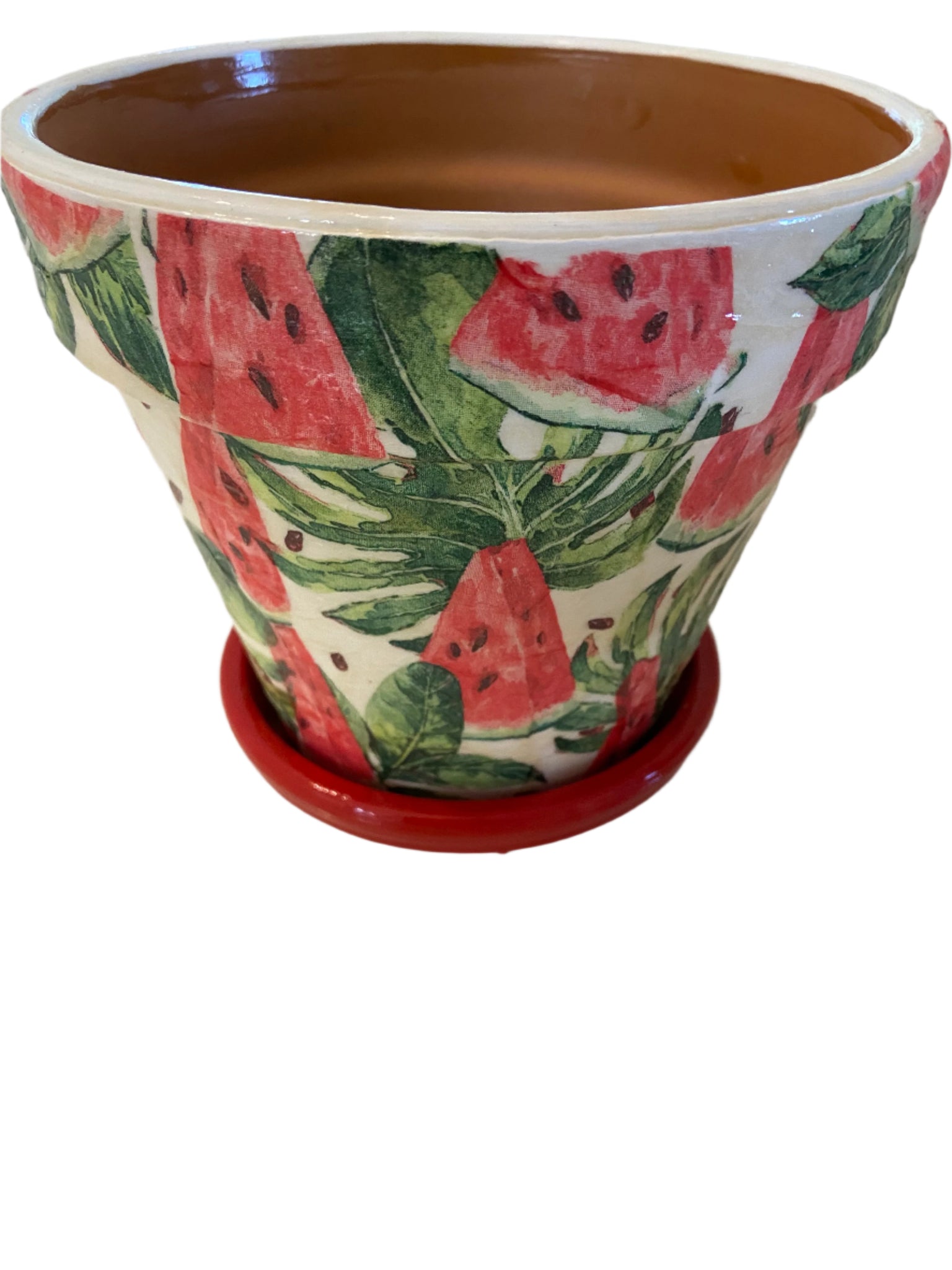 Hand painted white terracotta pot, decoupaged with a jolly watermelon design & comes with a coordinating red base plate. Pot is sealed and suitable for inside or undercover use.