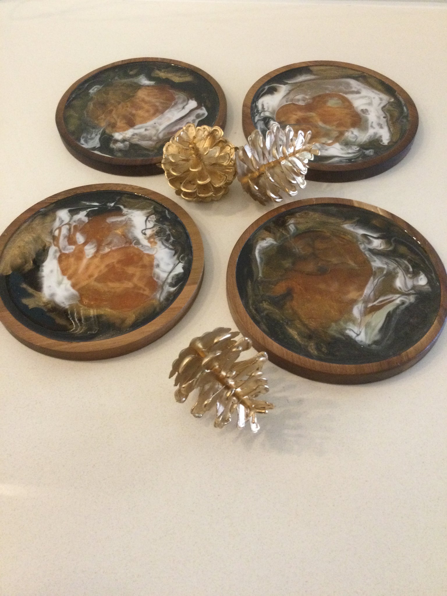 A set of 4 Bamboo & Resin coasters with stunning colours of bronze, white, black & gold