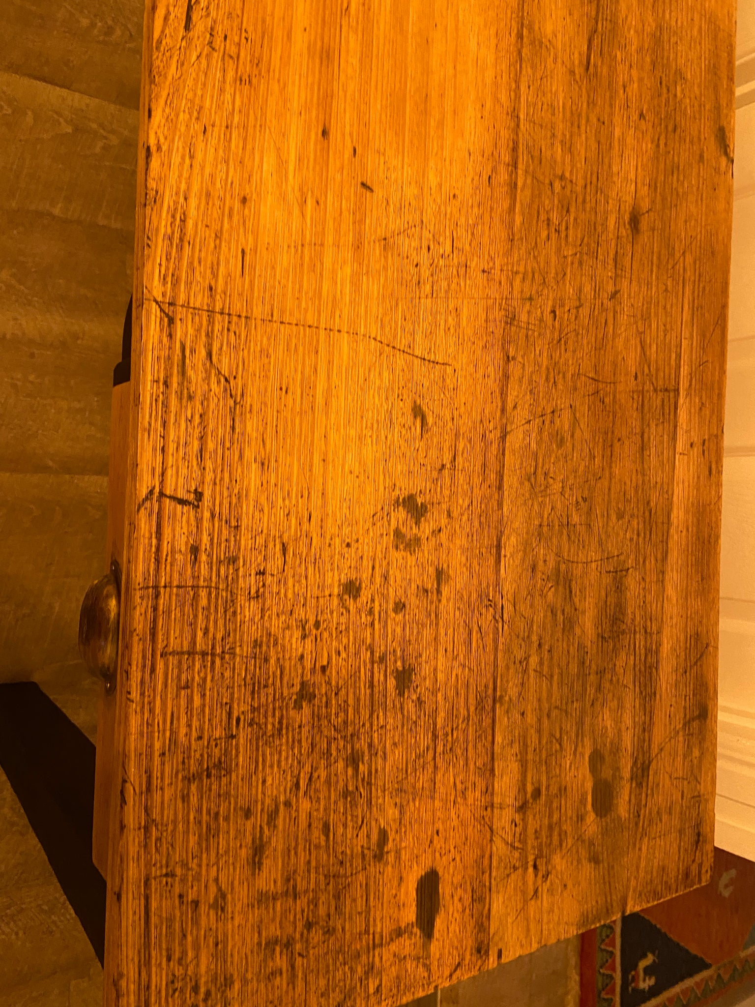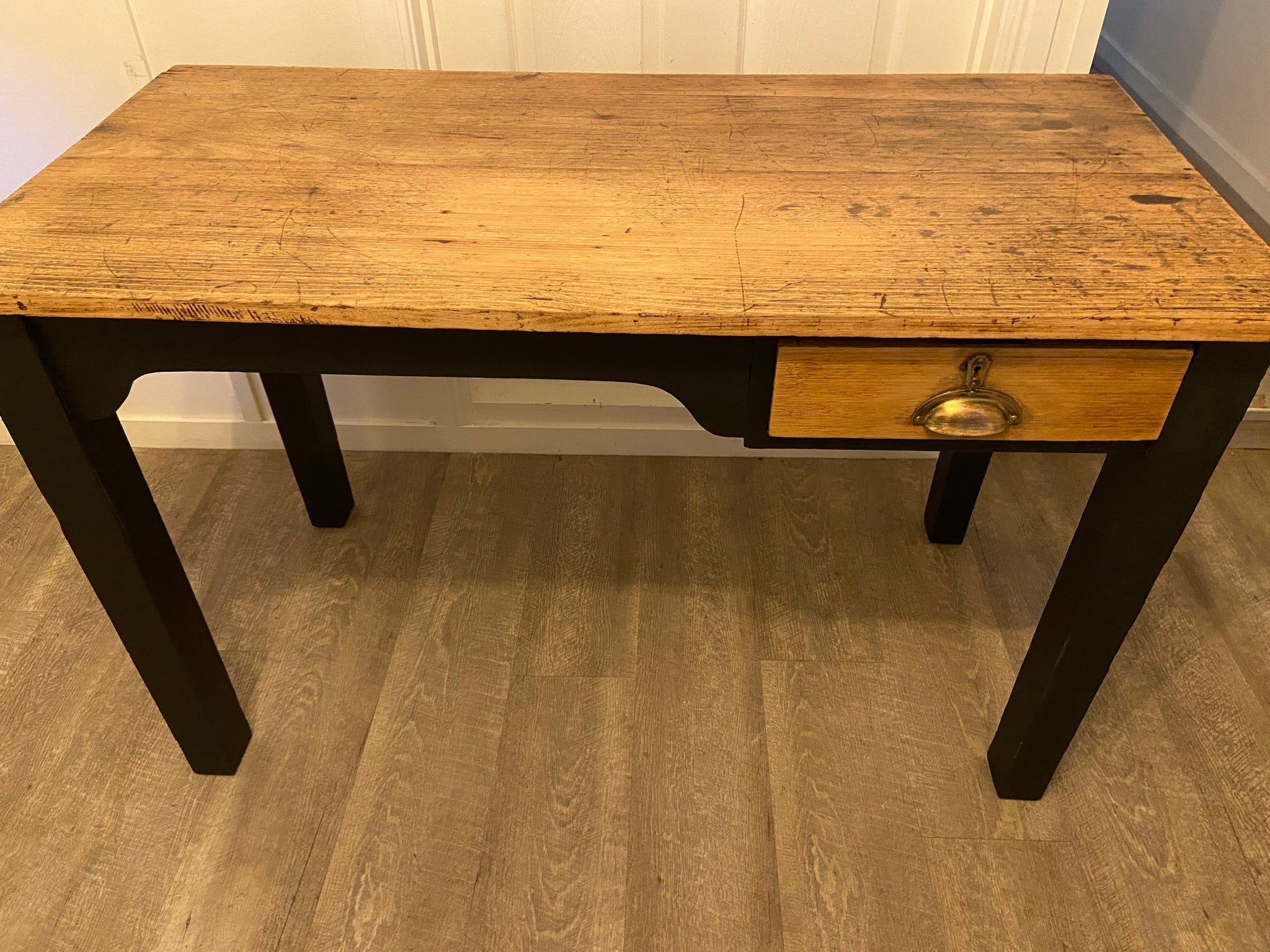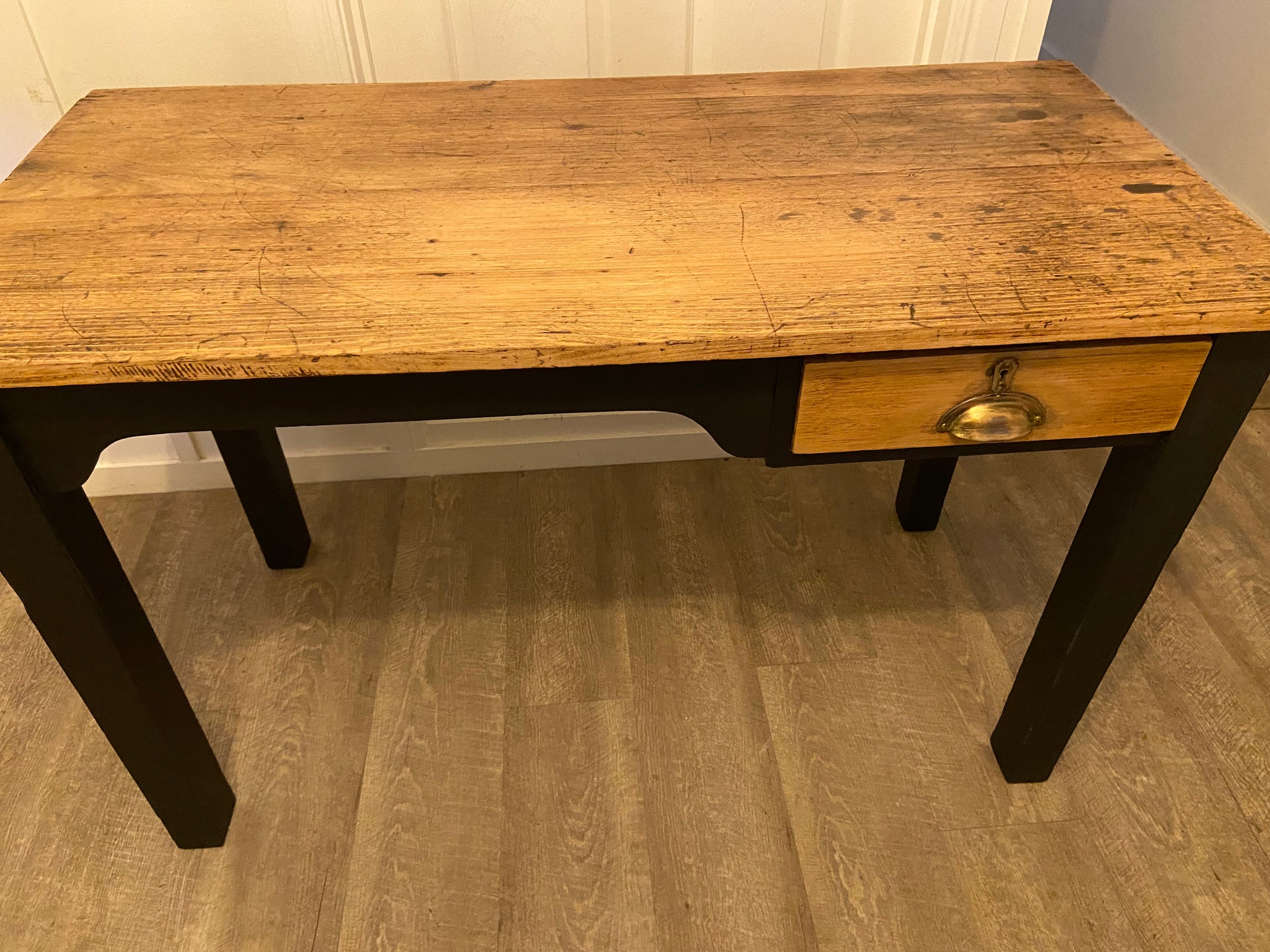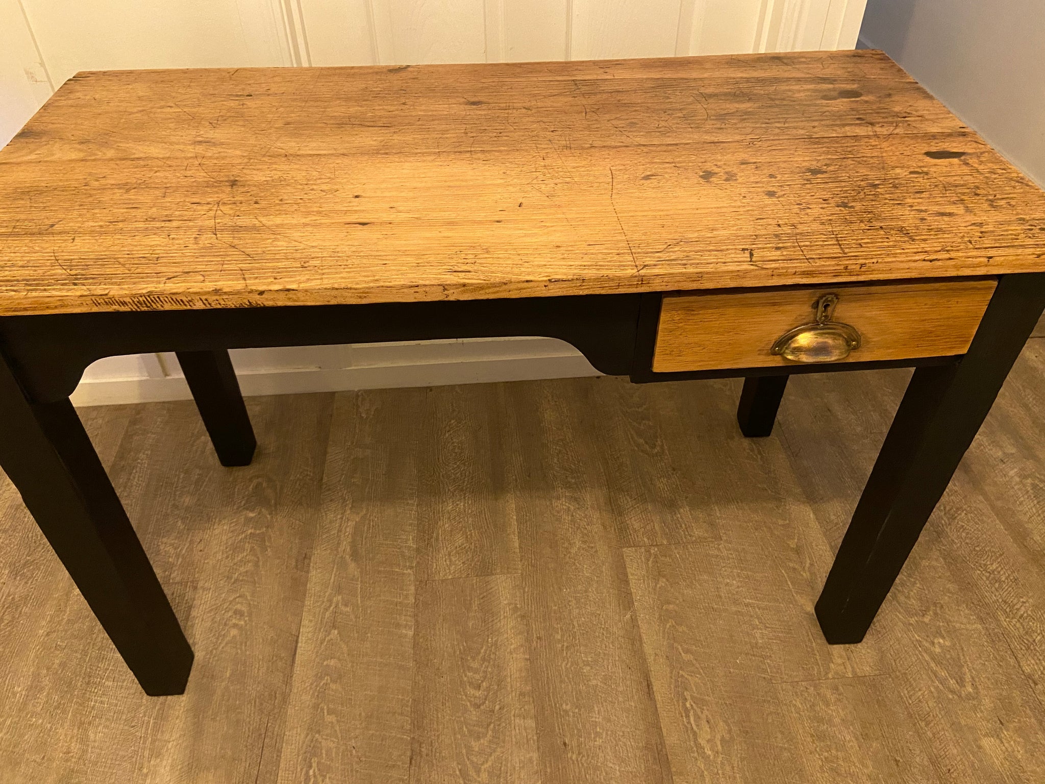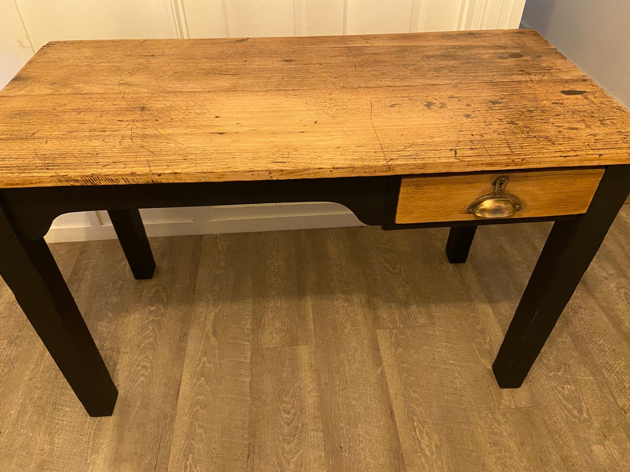 Beautiful refurbished wooden desk, painted in a black mineral paint called Midnight. The top and drawer have been sanded back to natural & sealed many times. I have deliberately left the top with its age imperfections (ink spots, carvings etc) as I love this look & the story it tells.