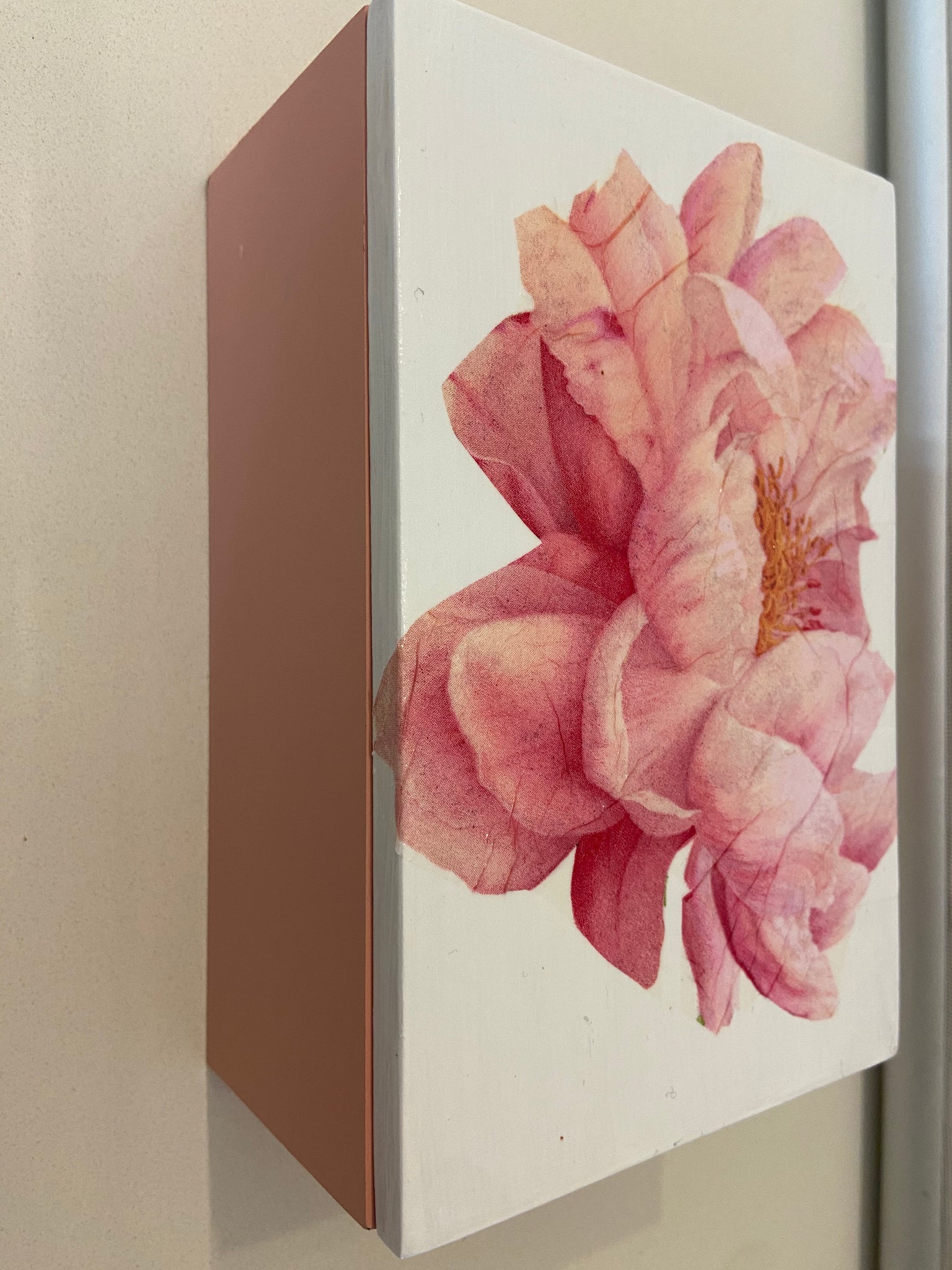 Hand painted wooden jewellery box decoupaged with a gorgeous pink flower design, the inside is is a soft pink velvet and the top has been sealed for protection.