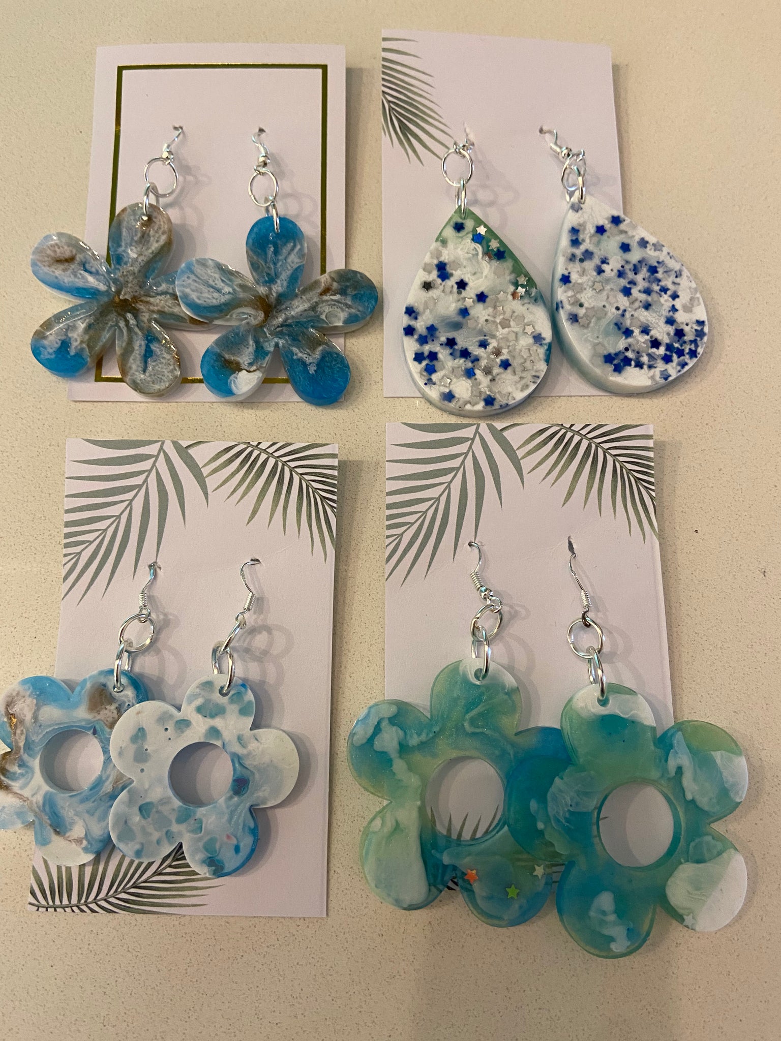 An extensive range of resin earrings in different colours & styles (please direct message to request something specific).  They will be the most comfortable earrings you wear as they are super light. Earrings are $10 @ and include hook stoppers and packaging.