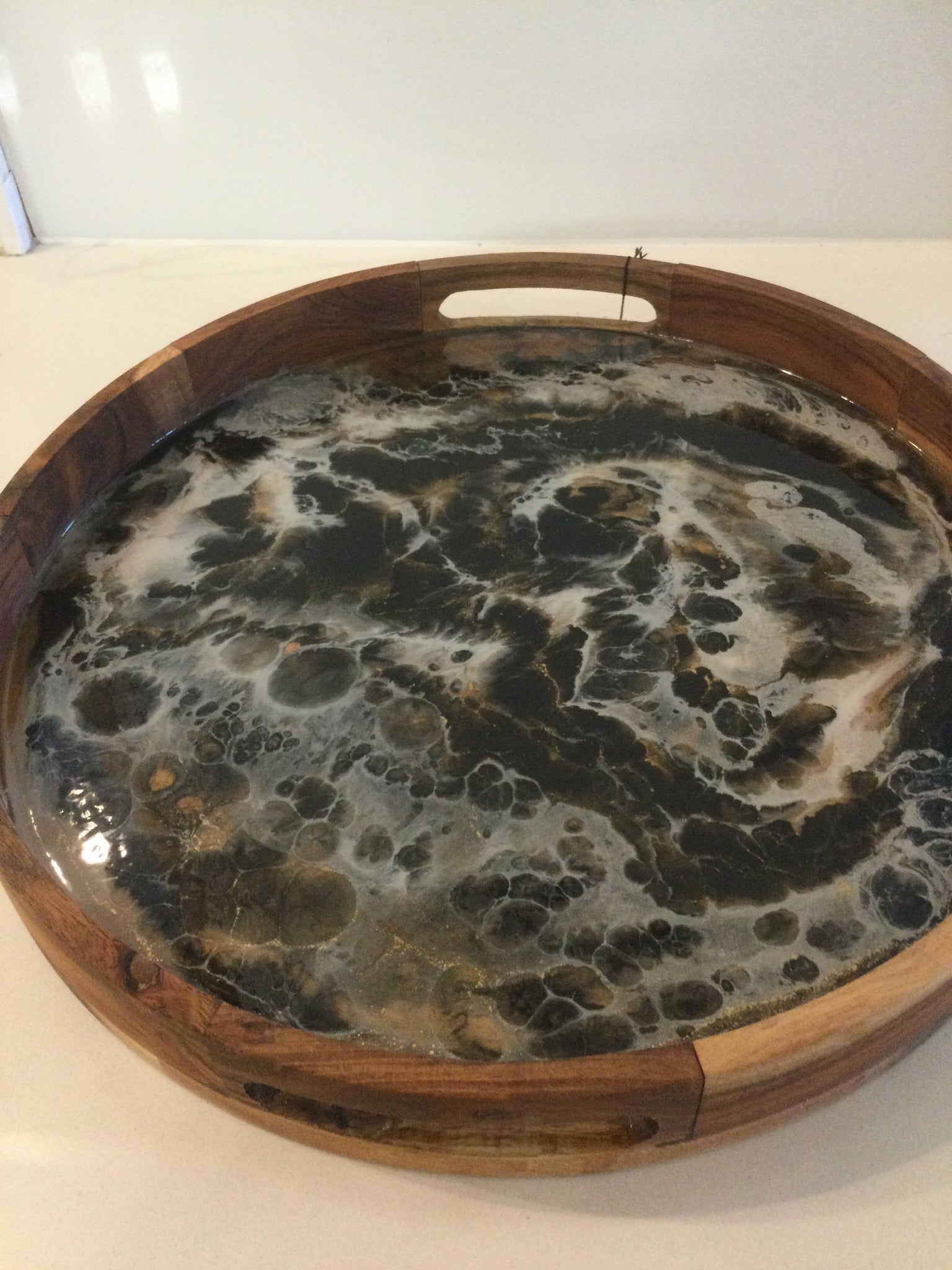 A resin & acacia wood serving tray in stunning colours of black, copper, white & gold.