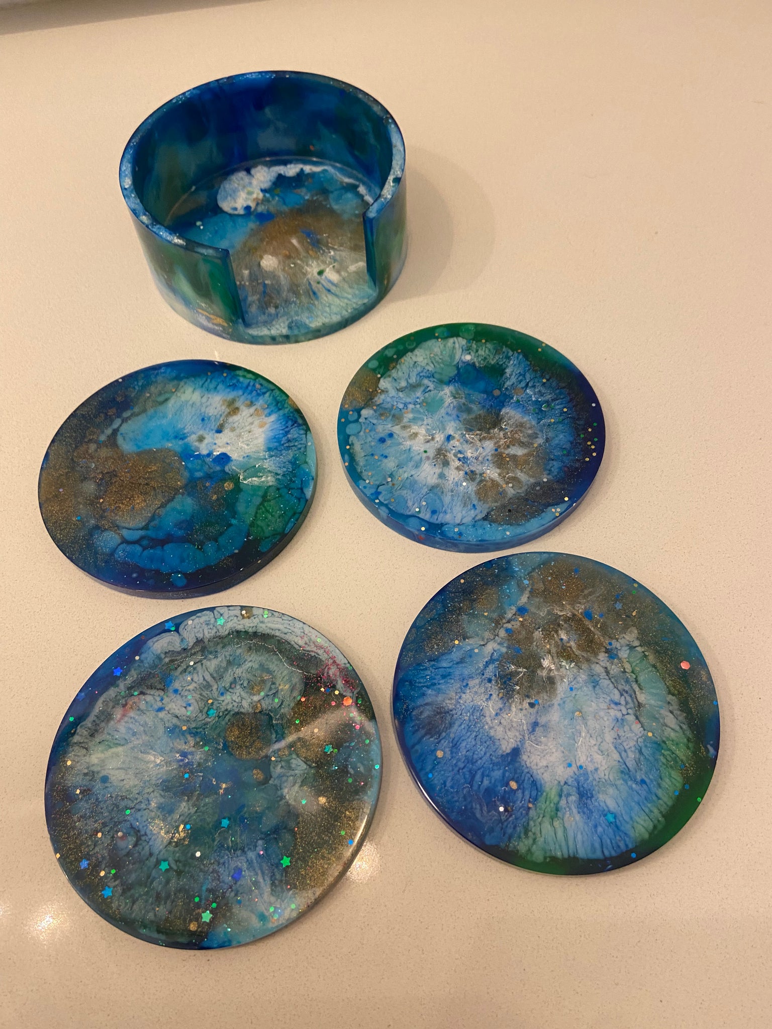 A set of 4 Resin Coasters & Holder in gorgeous colours of greens, blues, gold & white.