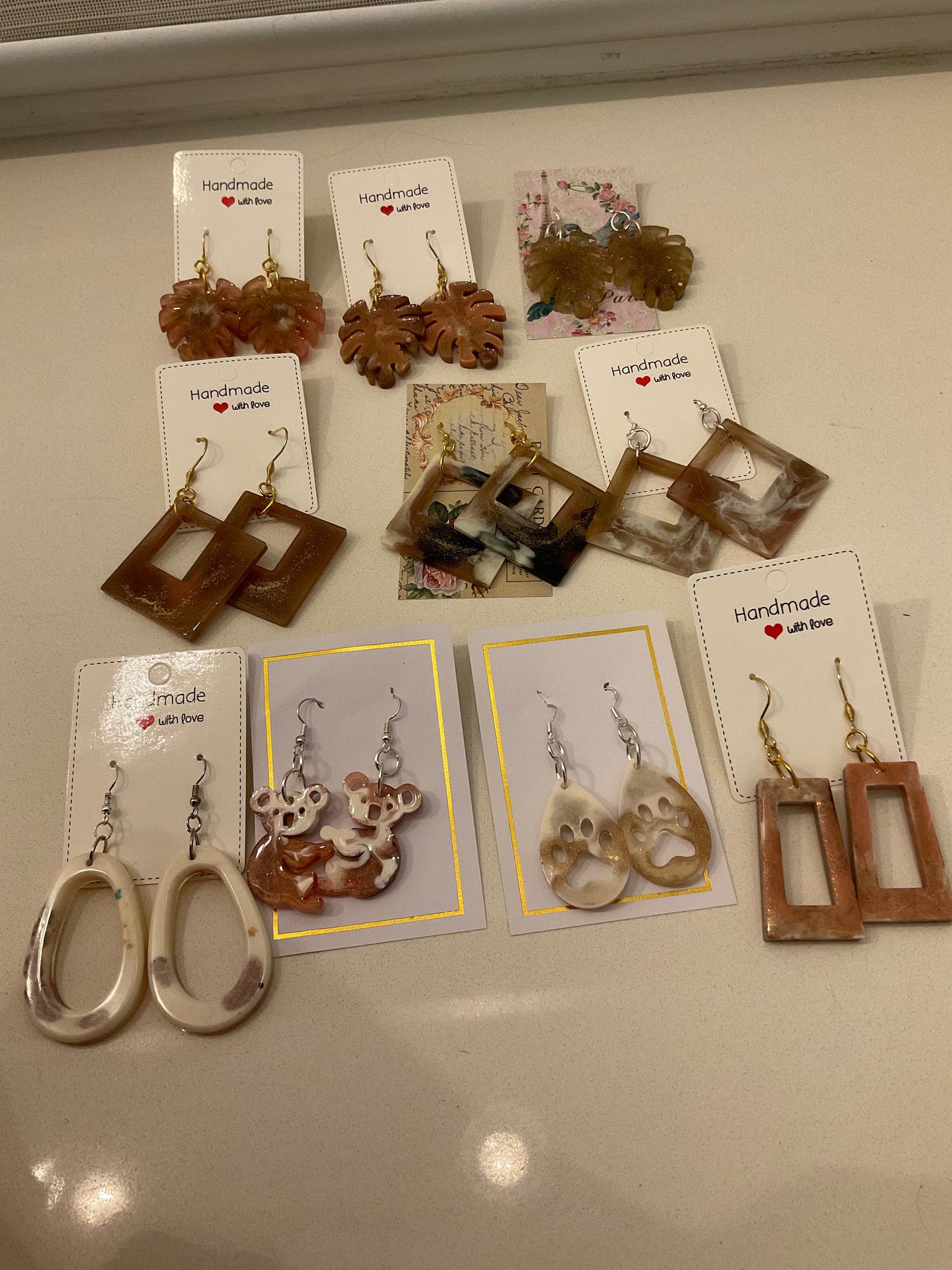 Lots of resin earrings in assorted styles & colours, priced at $10@