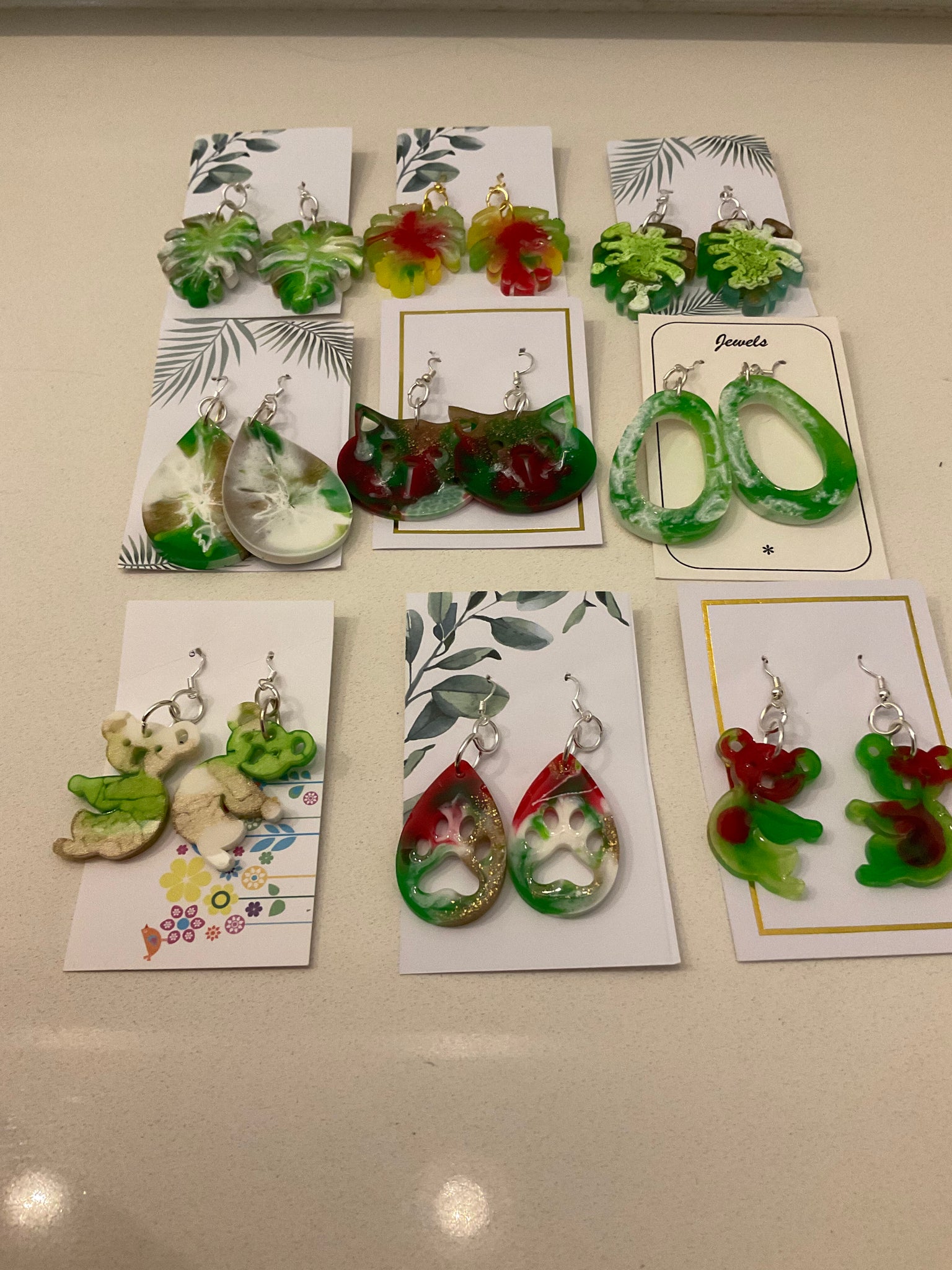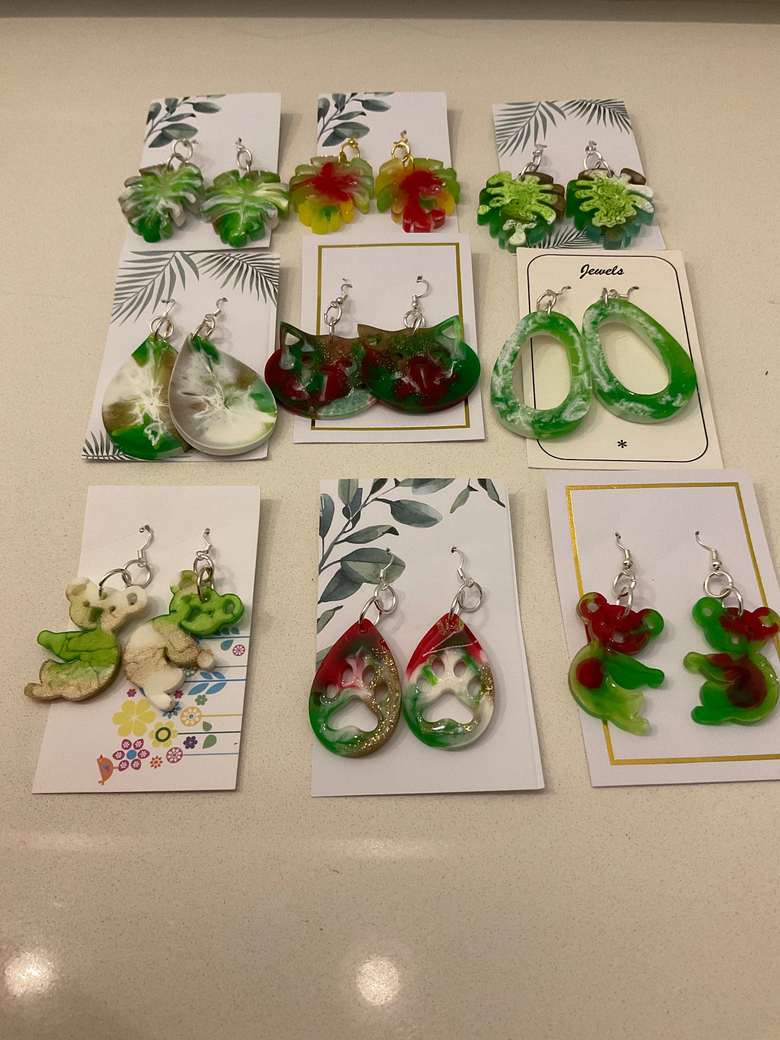 Lots of resin earrings in assorted styles & colours, priced at $10@