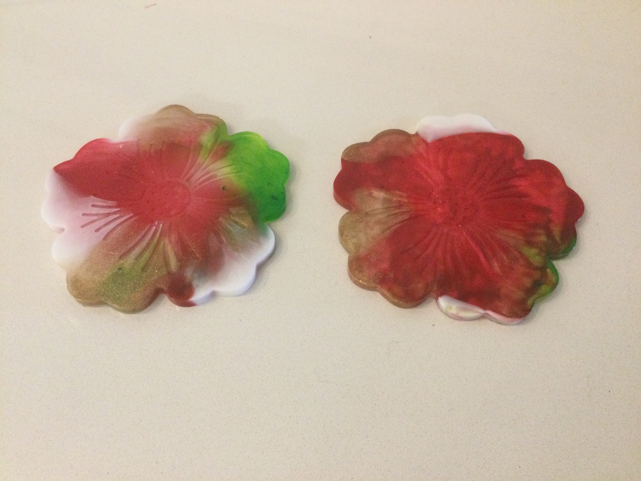 Gorgeous resin flowers in red, gold, green & a hint of white, set of 2