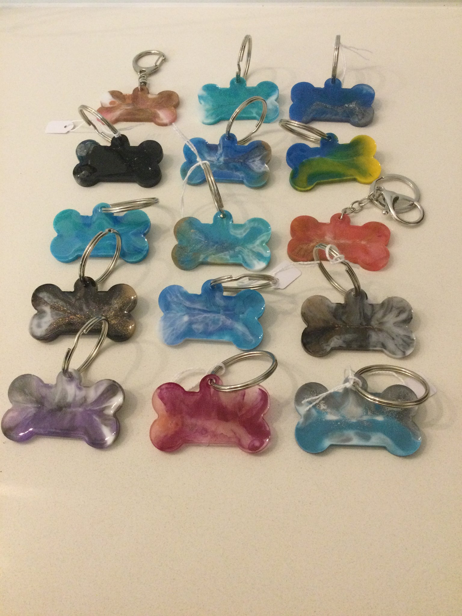 Jolly resin bone key rings made with resin and available in assorted colours they measure 6cm across & are priced per item, please direct message to request specific colours and/or view further items. Also items can be posted.