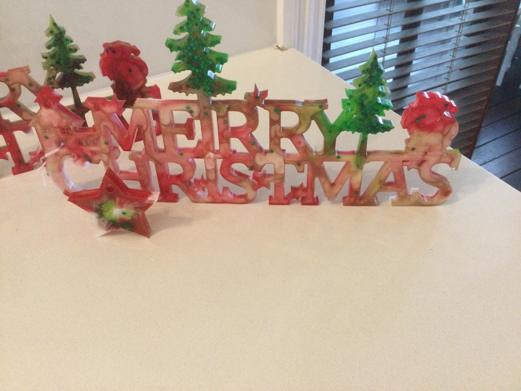 Very Jolly resin Merry Christmas signs can be hung or sitting on a ledge etc. Christmas colours of red, green, white & gold, with a touch of glitter.