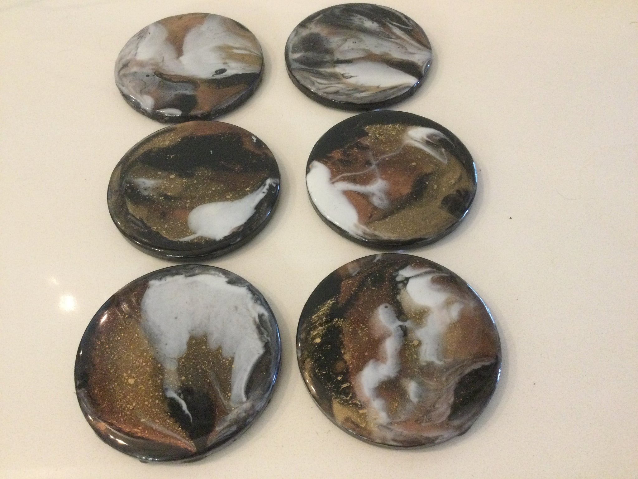 A set of 6 resin & wood coasters, in gorgeous colours of black, bronze, copper & white & the backs have been hand painted in black & include dots for protection.