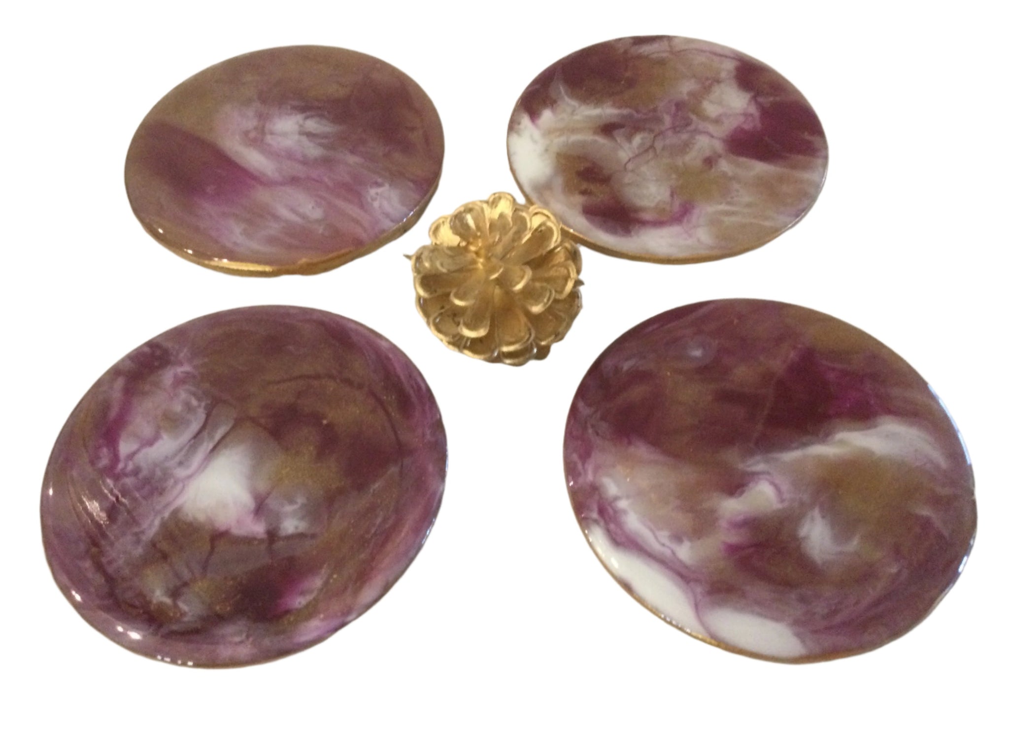 A set of 4 resin & cork coasters, in gorgeous pinks, gold, copper & white, the backs have been hand painted in gold and include dots for protection.