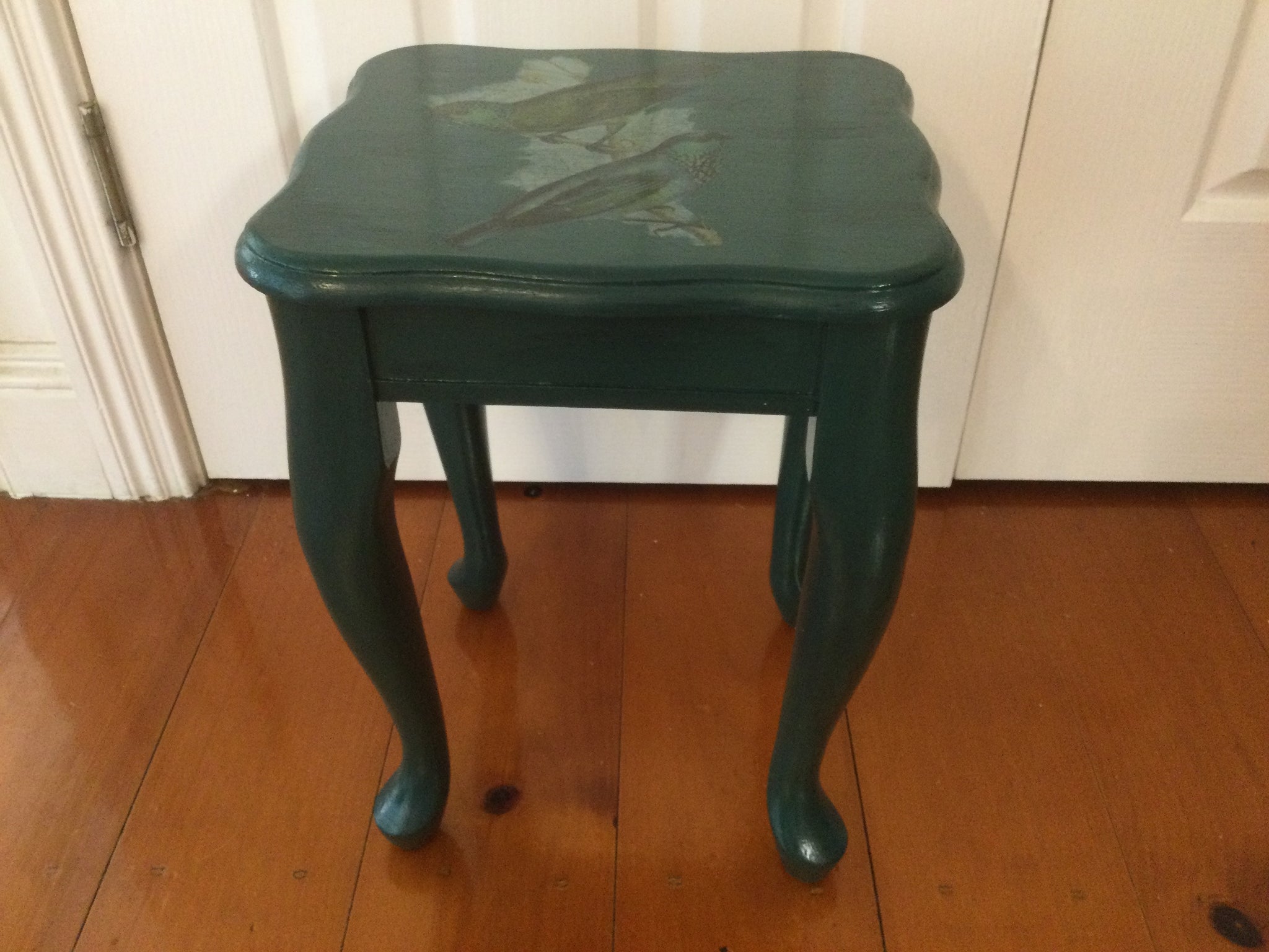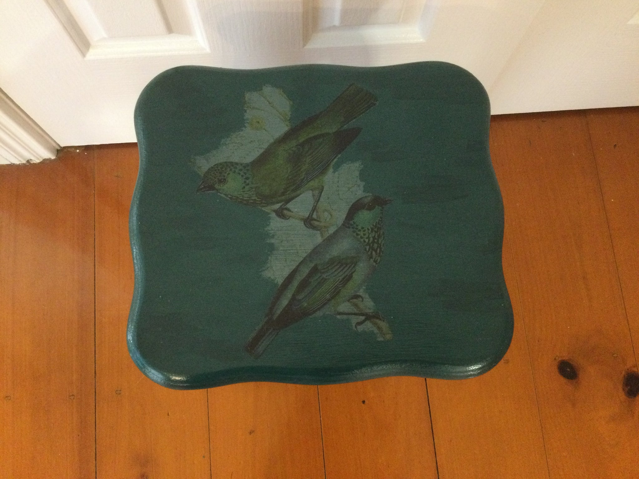 A gorgeous refurbished table in emerald green chalk paint, with bird transfers. Sealed all over an older and very solid piece.