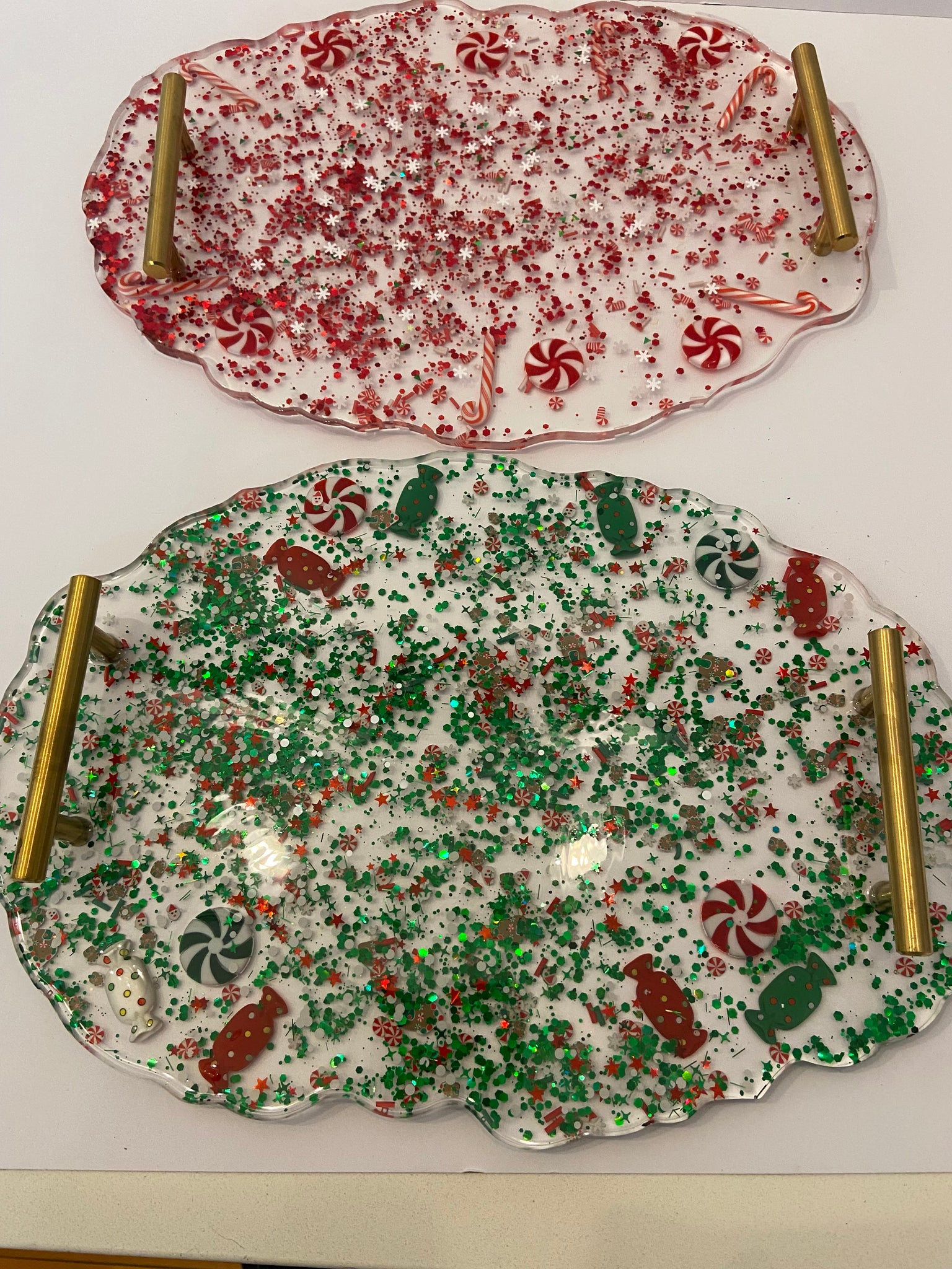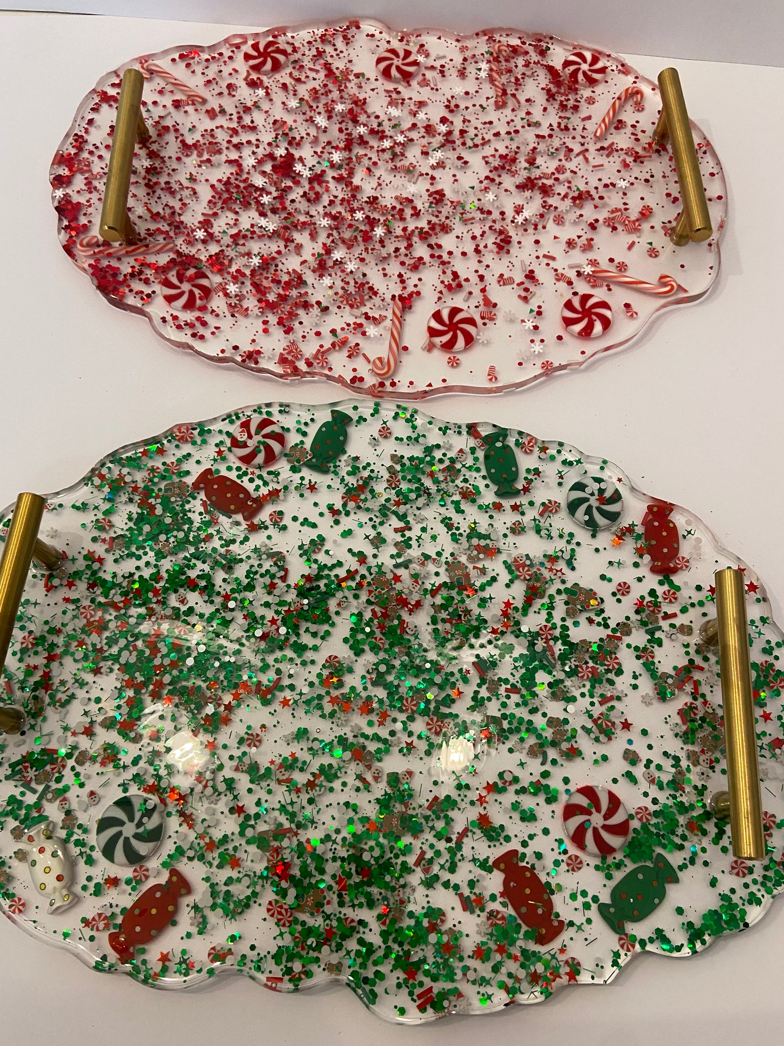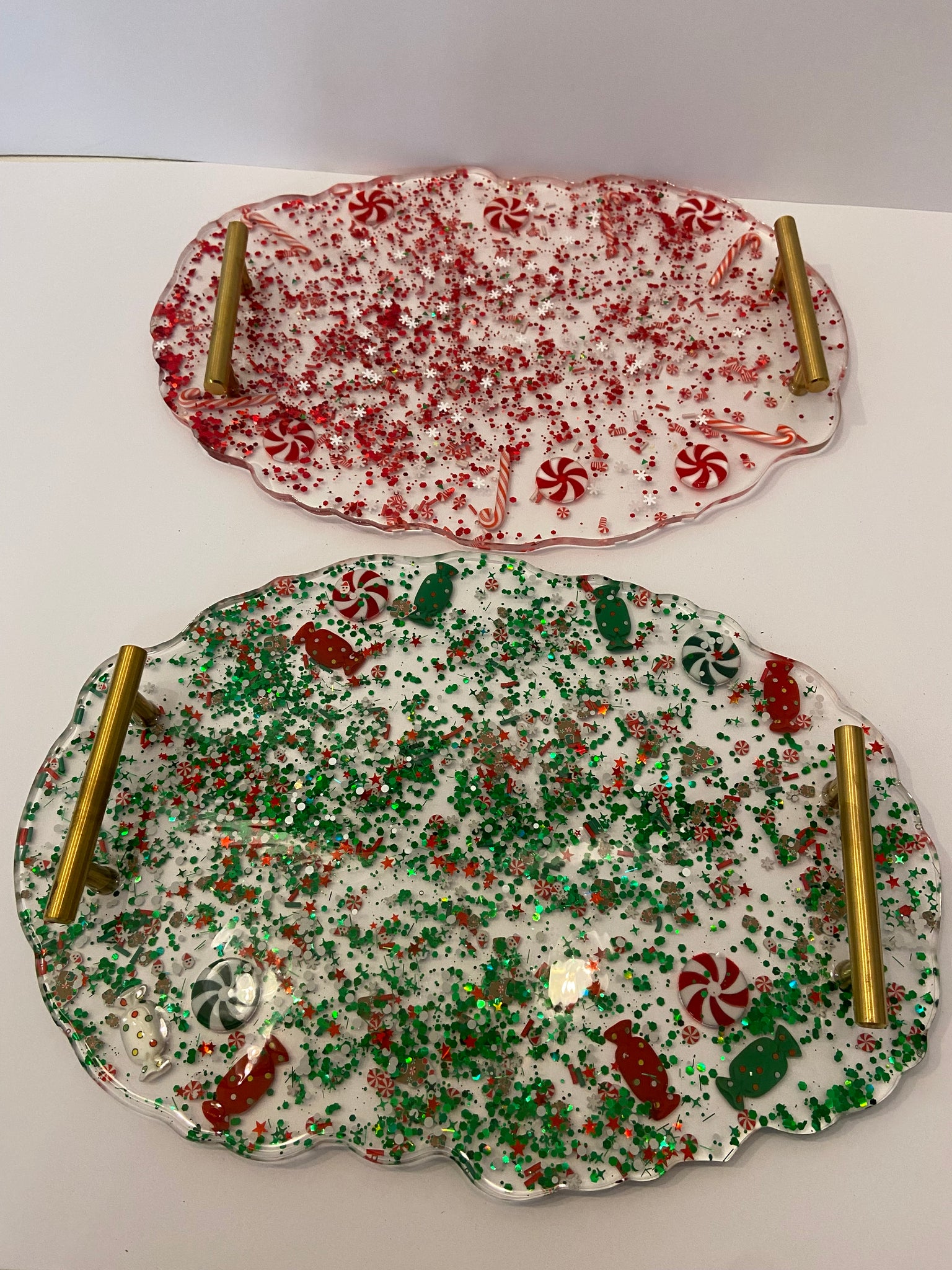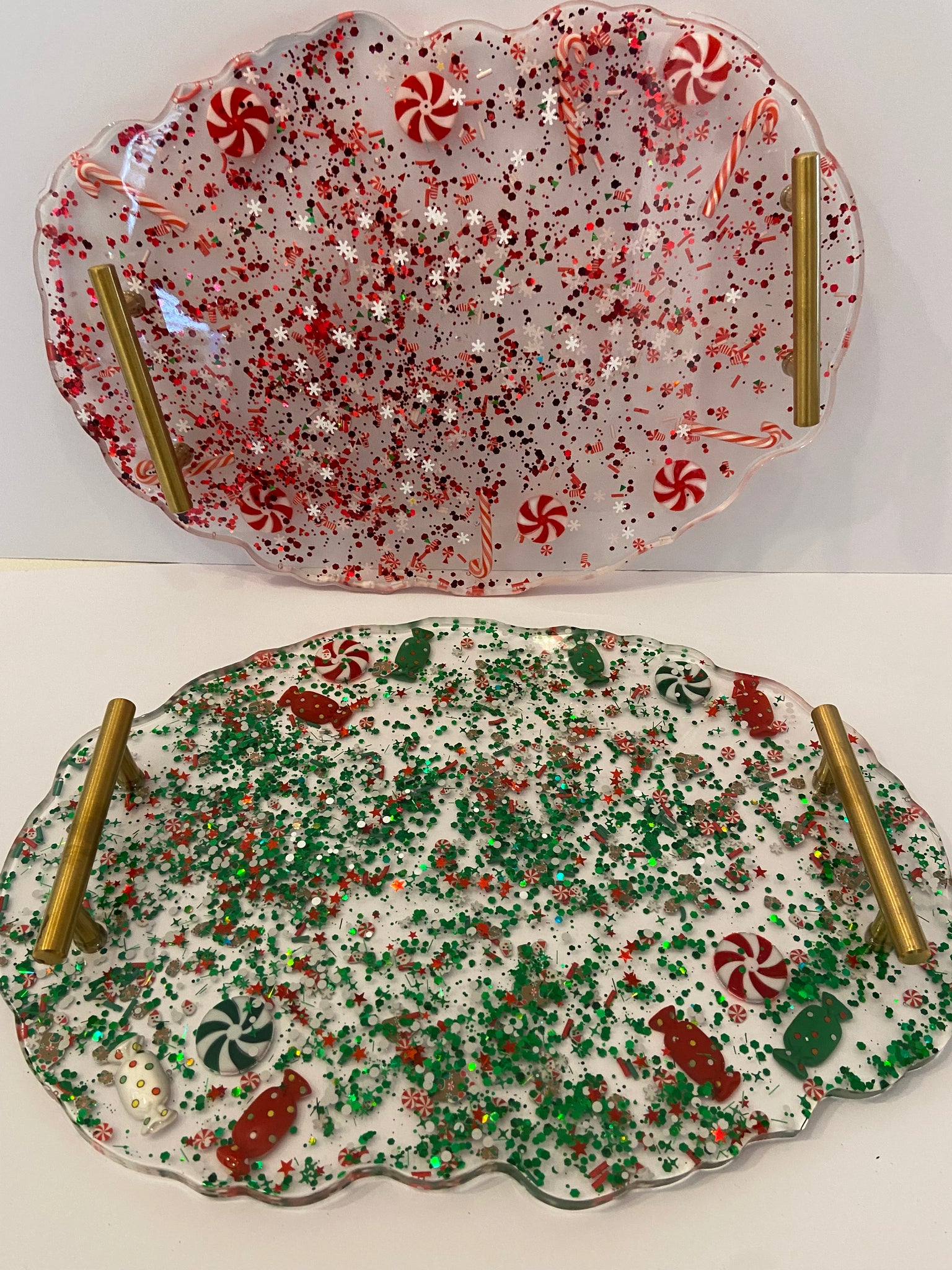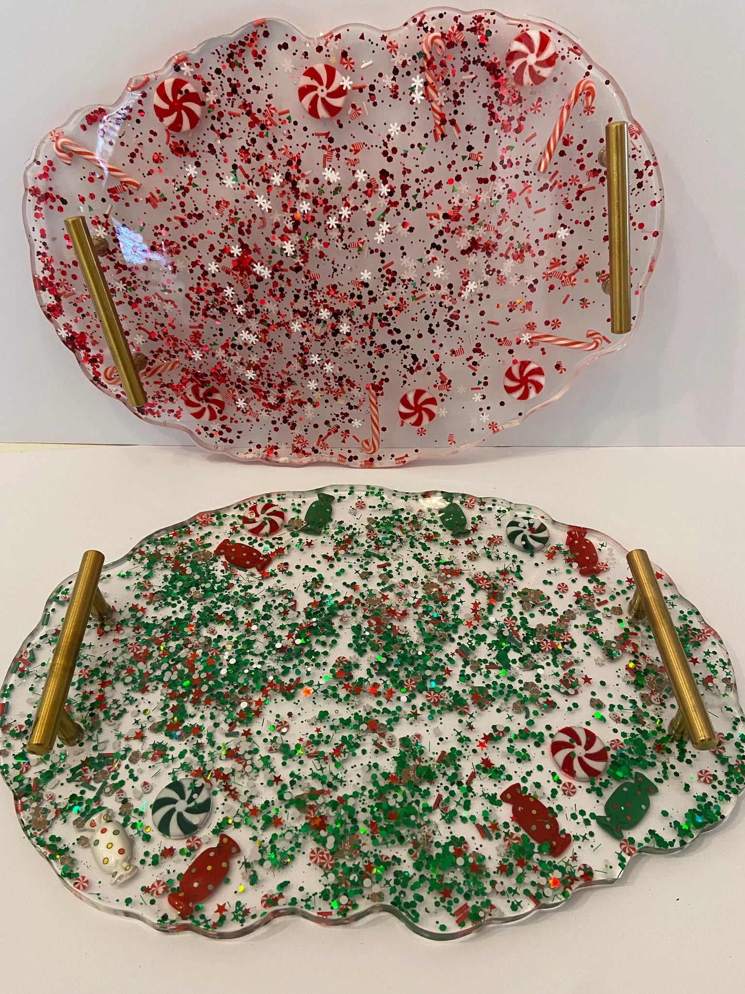 Resin display or serving plate Christmas themed in greens & red or red with a touch of white.