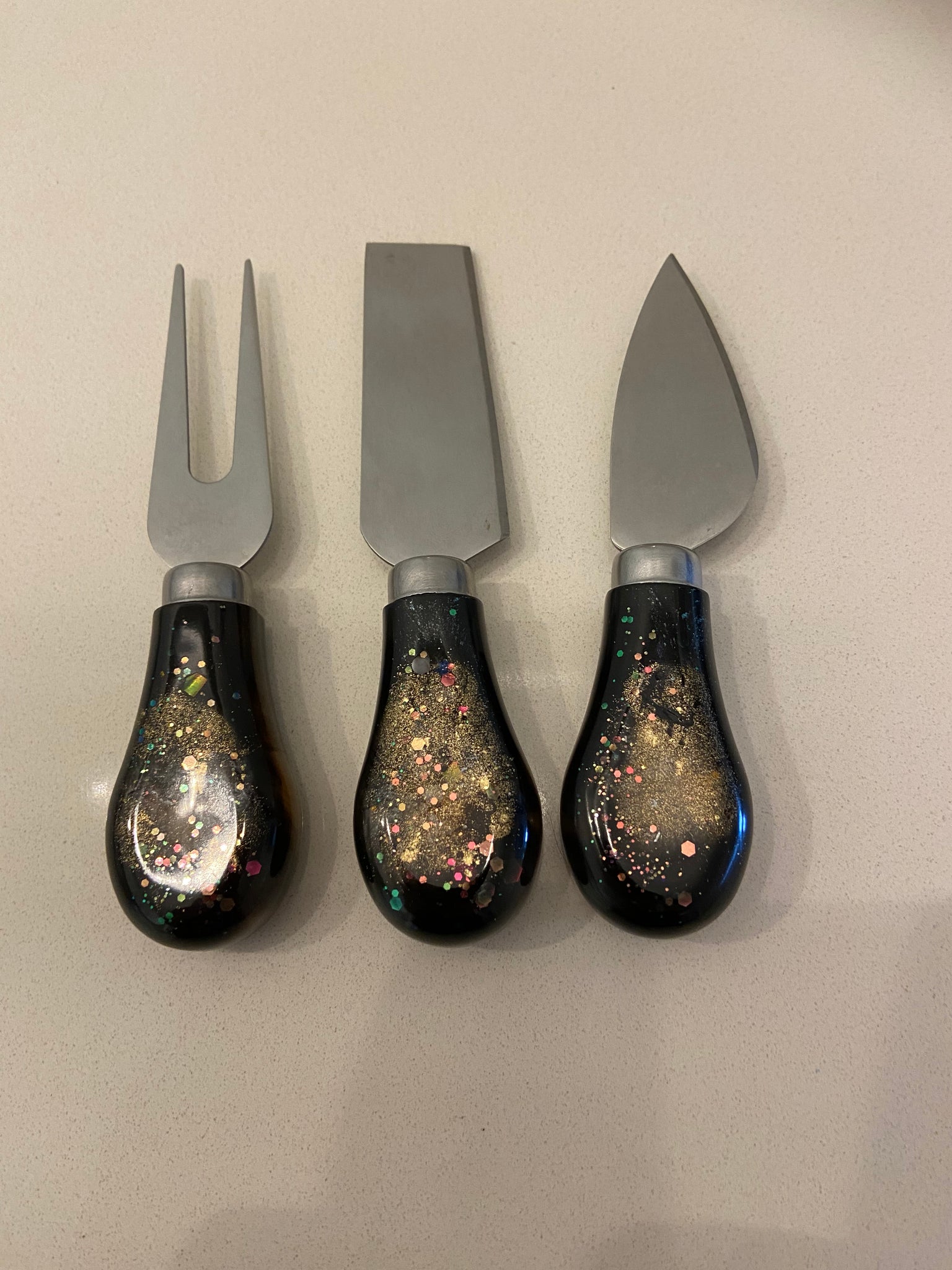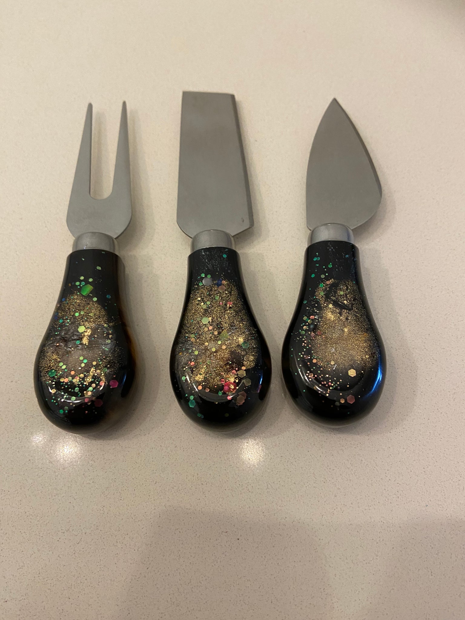 Resin handles cheese knives, these ones in stunning colours of black, gold & bronze with sparkles, comes as a set of 3.