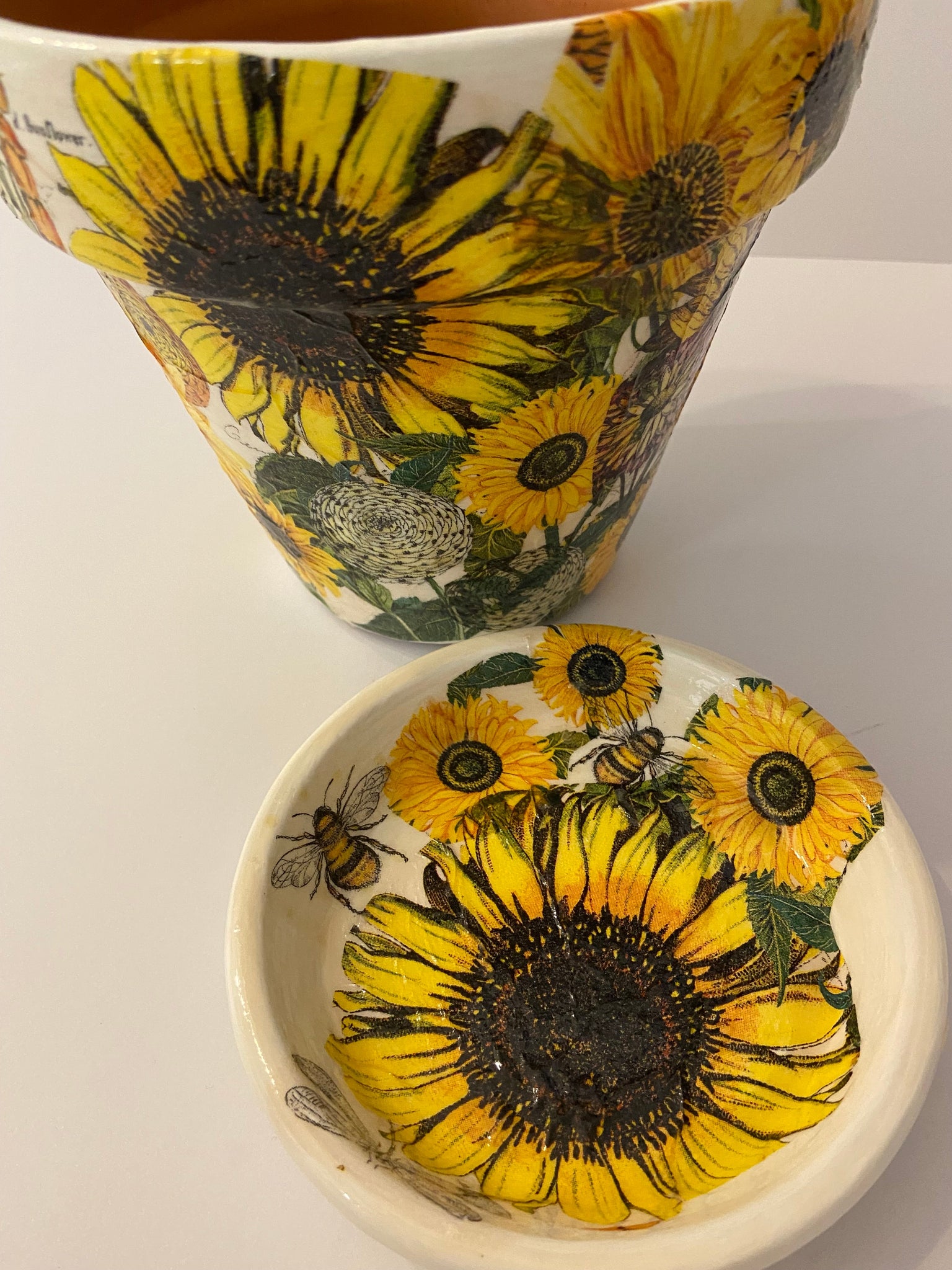 Hand painted white terracotta pot, decoupaged with a gorgeous sunflower design and a matching base plate. Pot is sealed and suitable for inside or undercover use.