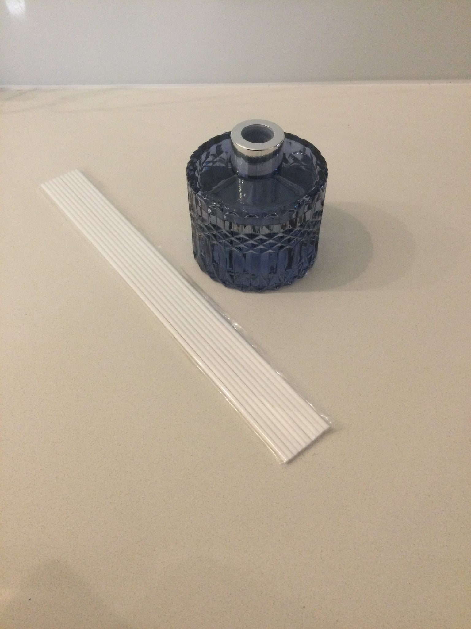 Gorgeous blue glass decanter with white sticks diffuser scented with Pear & Freesia