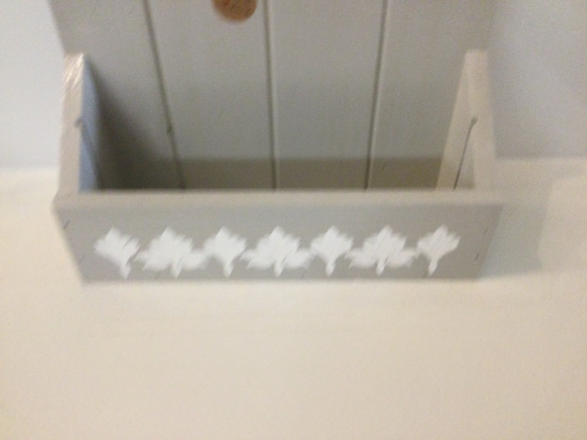 Cute upcycled wooden holder, painted grey with white stencilling.