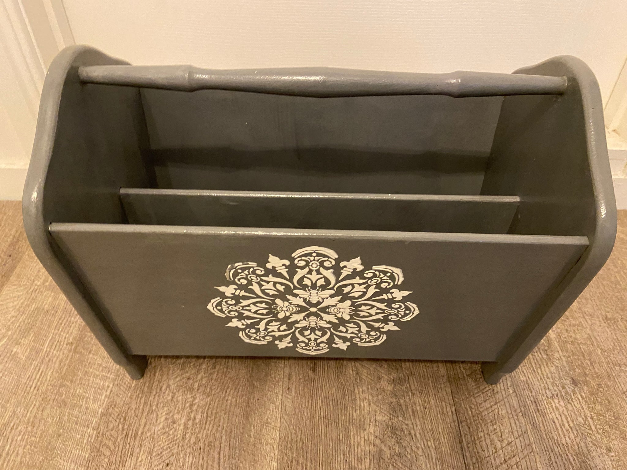 Jolly wooden refurbished magazine or other holder, mid grey colour with white raised stencilling