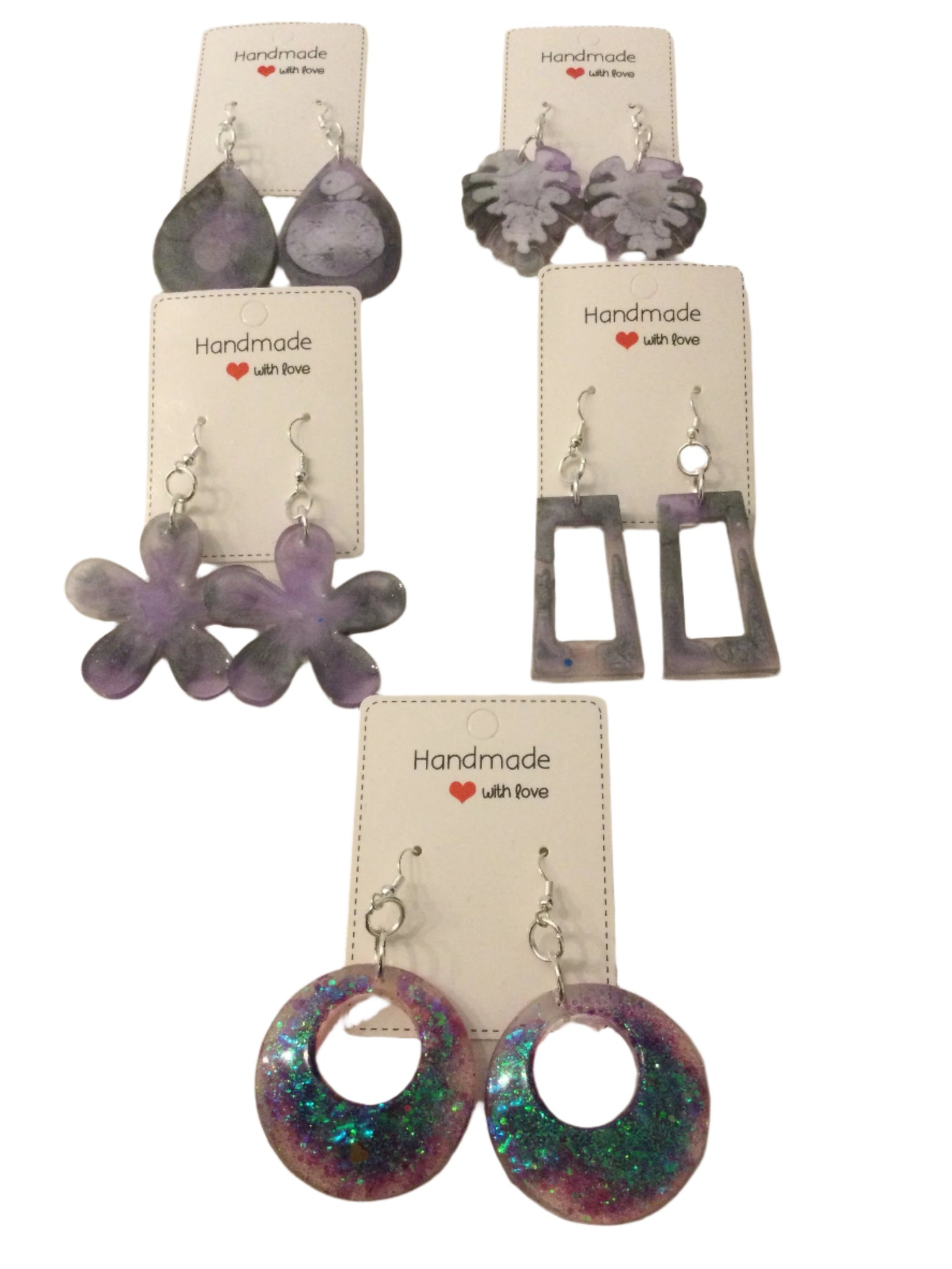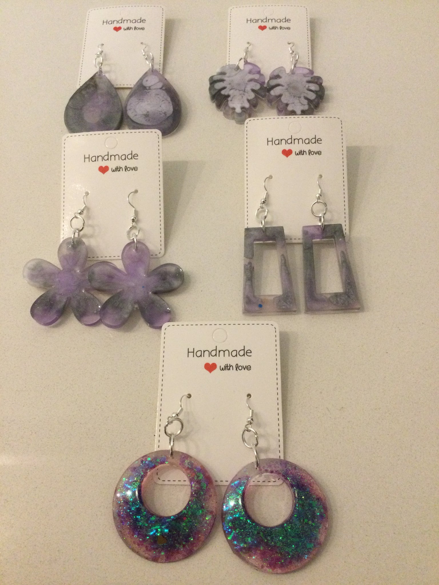 An extensive range of resin earrings in different colours & styles (please direct message to request something specific).  Earrings are $10 @ and include hook stoppers and they are presented on a card.