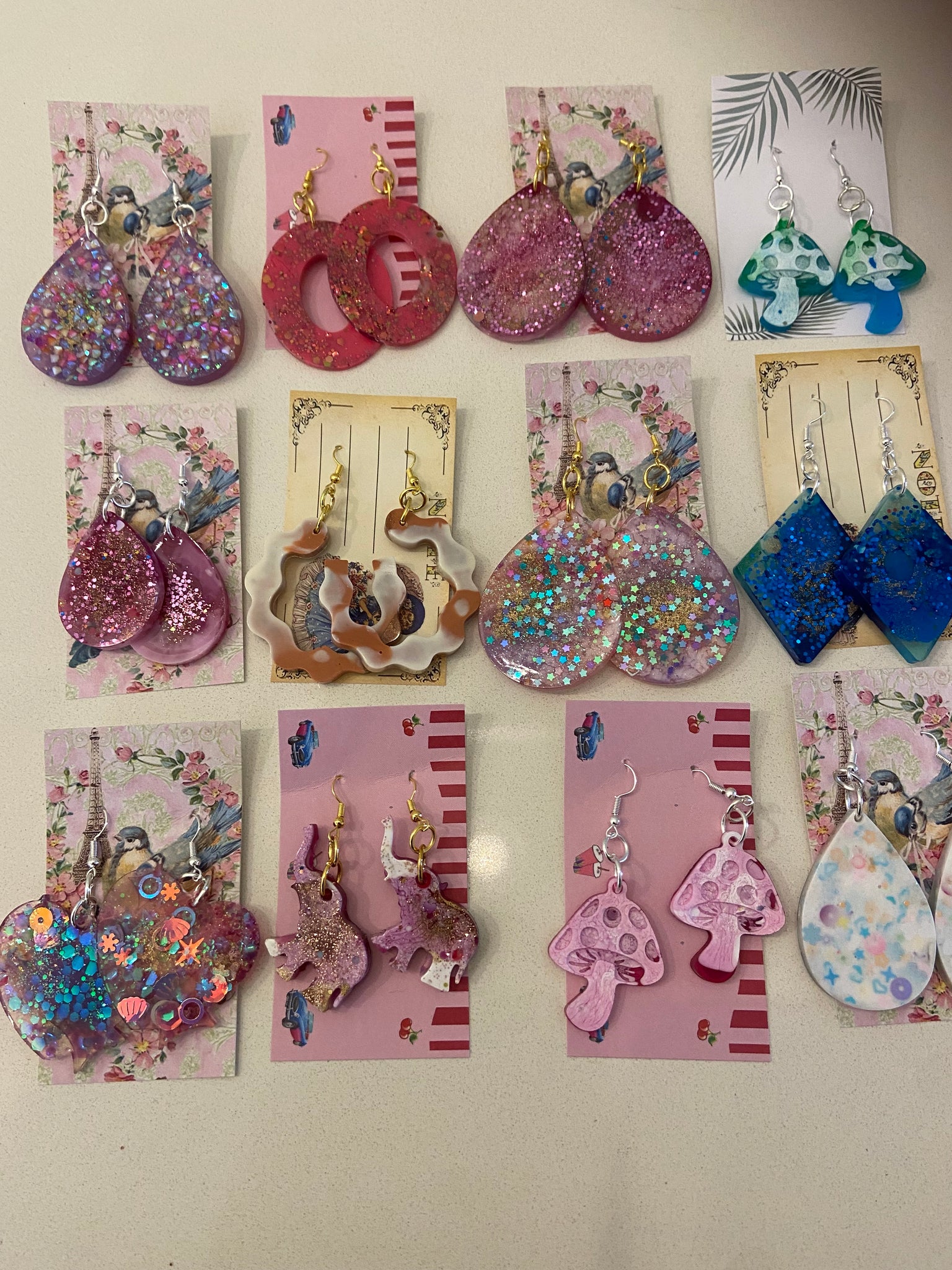 An extensive range of resin earrings in different colours & styles (please direct message to request something specific).  They will be the most comfortable earrings you wear as they are super light. Earrings are $10 @ and include hook stoppers and packaging.