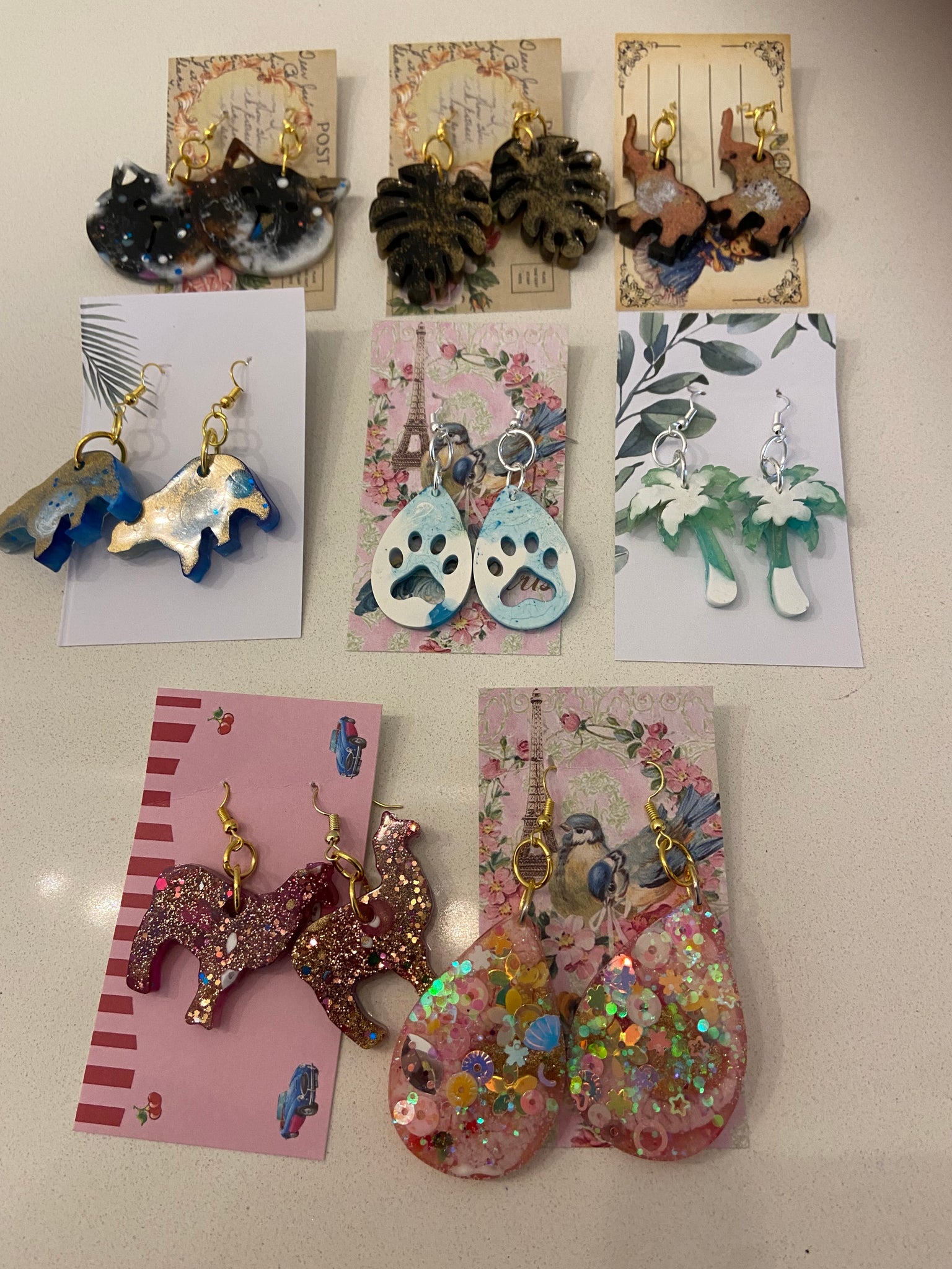 An extensive range of resin earrings in different colours & styles (please direct message to request something specific). Designs includes: paw prints, cats, polar bears, palm trees, elephants & llamas). They will be the most comfortable earrings you wear as they are super light. Earrings are $10 @ and include hook stoppers and packaging.