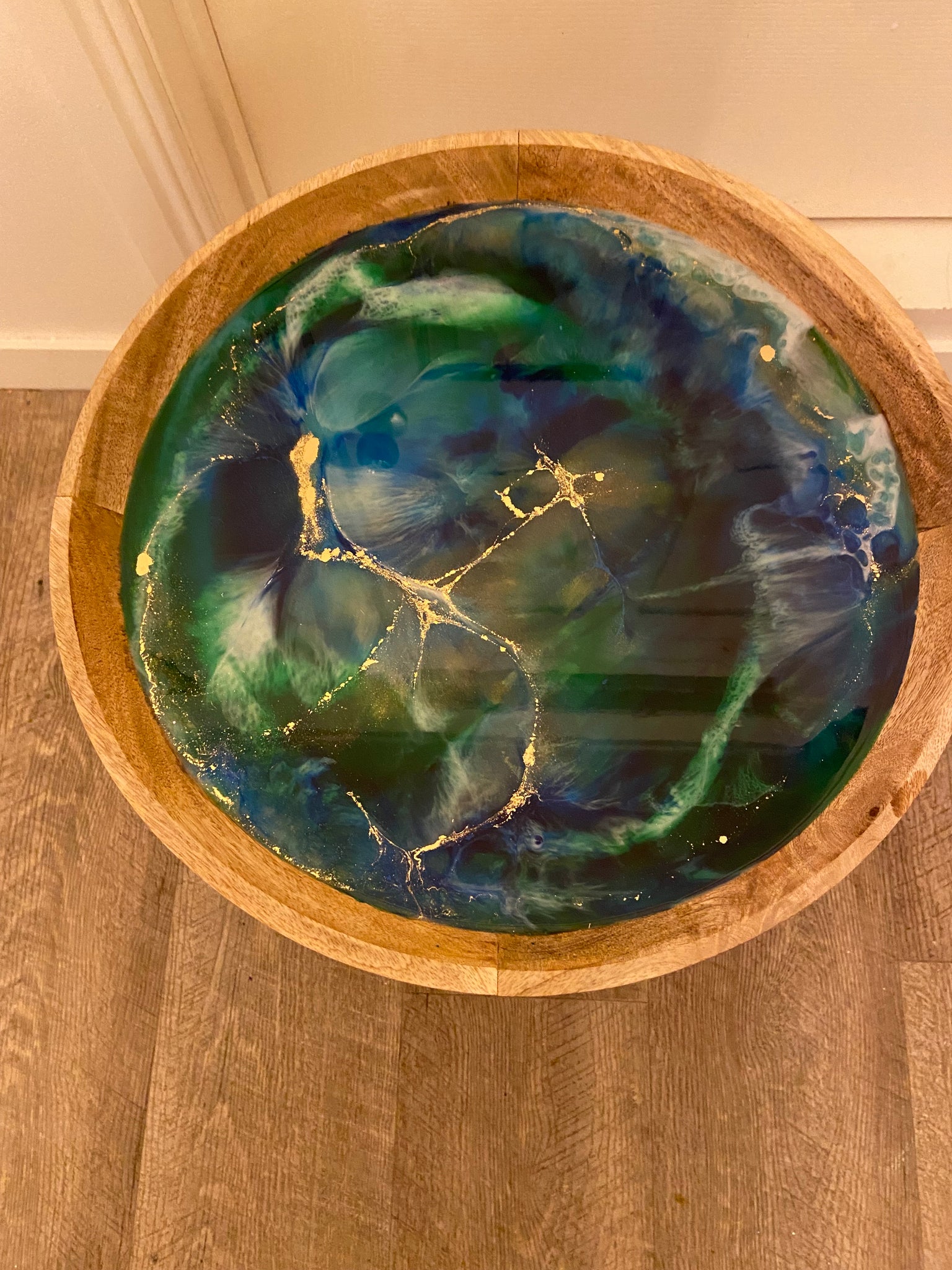 Unique & one of a kind wooded table with a resin top in stunning colours of blue, green, white & gold.