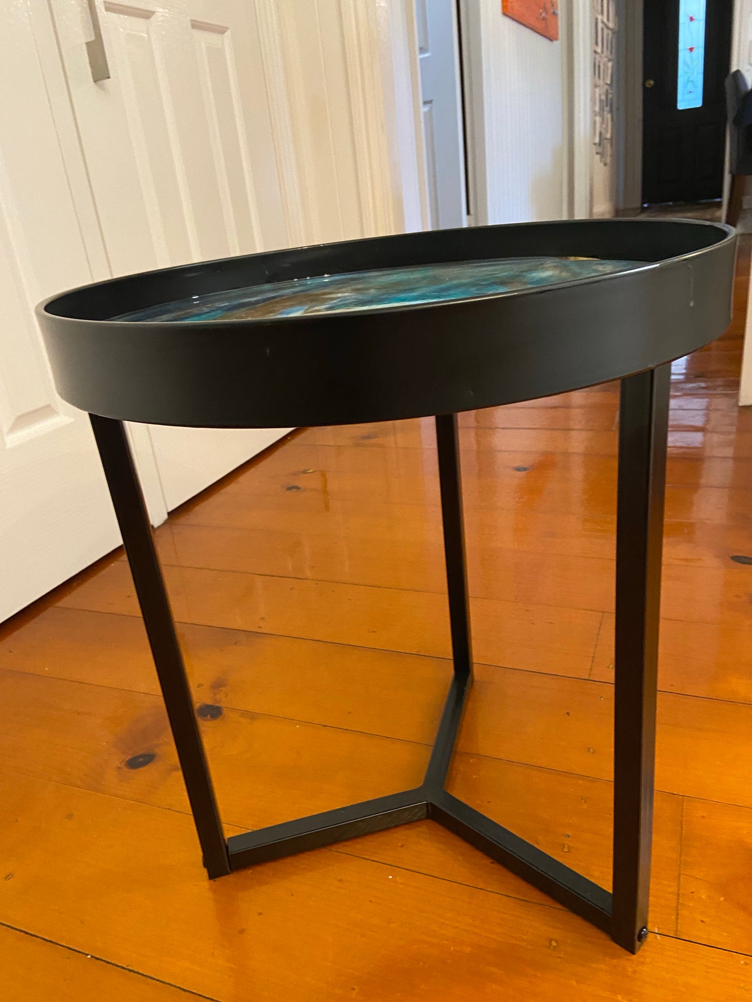 Black & resin three legged side table, gorgeous blues, with gold and splashes of white