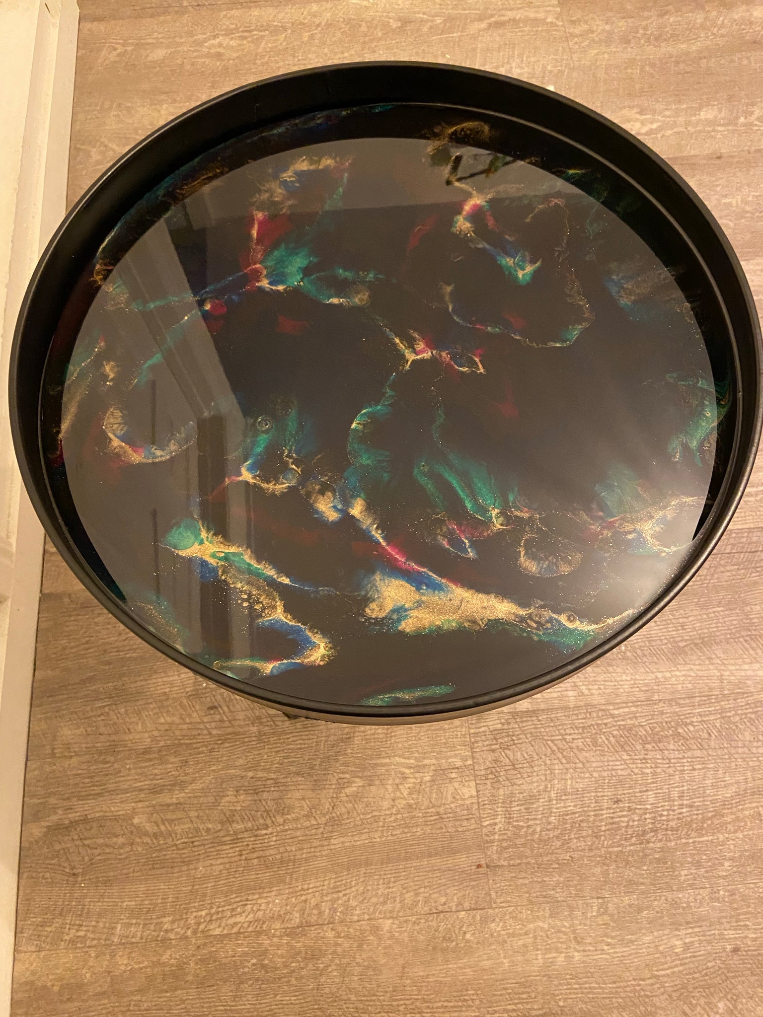 Black & resin three legged side table, gorgeous colours of black, green with gold and splashes of blue