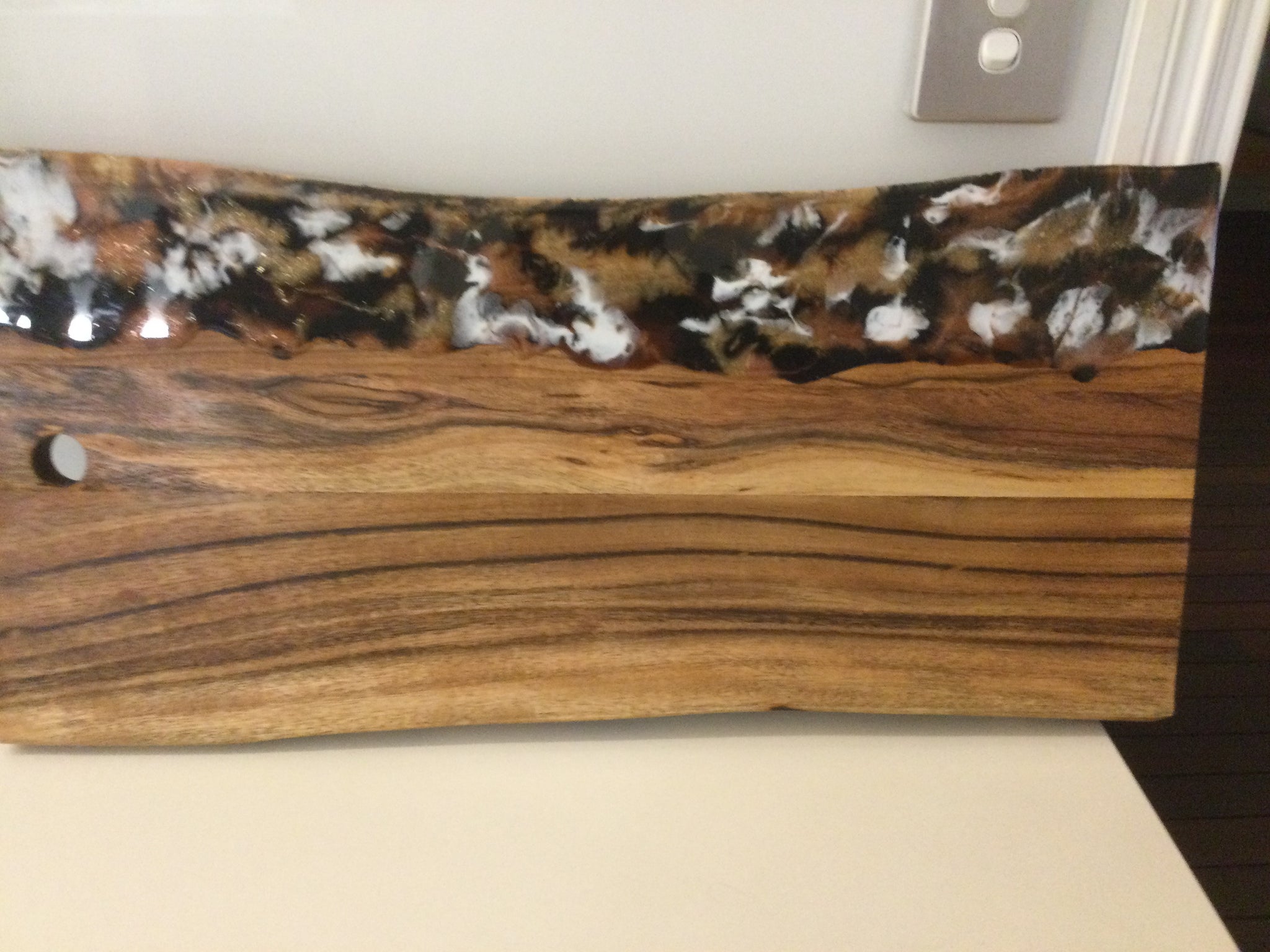 Acacia wood & resin serving board in stunning colours of black, white, copper, caramel & gold.