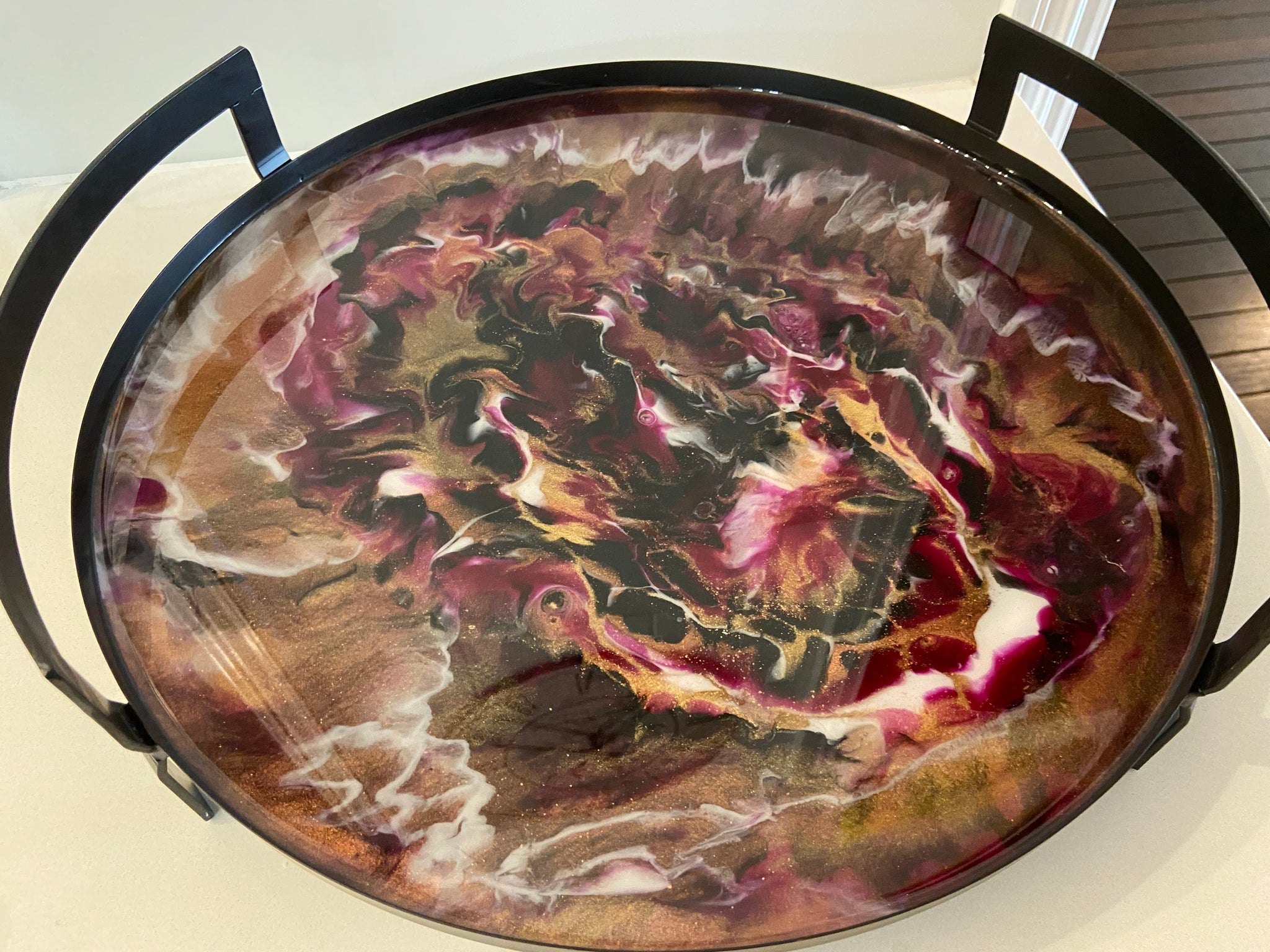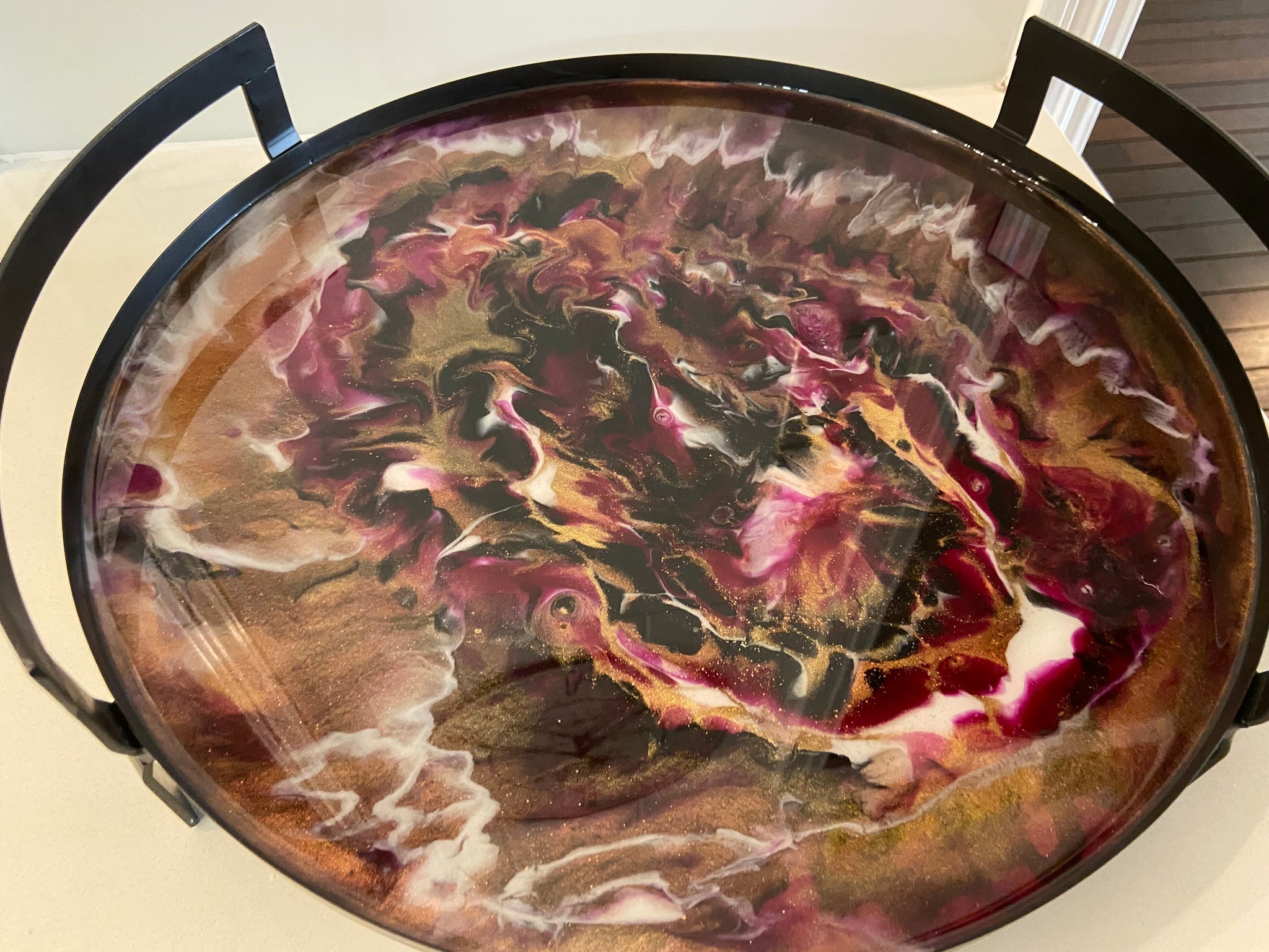 Black wrought iron base & handles with a resin top. A stunning mix of colours including pinks, gold, black & white.